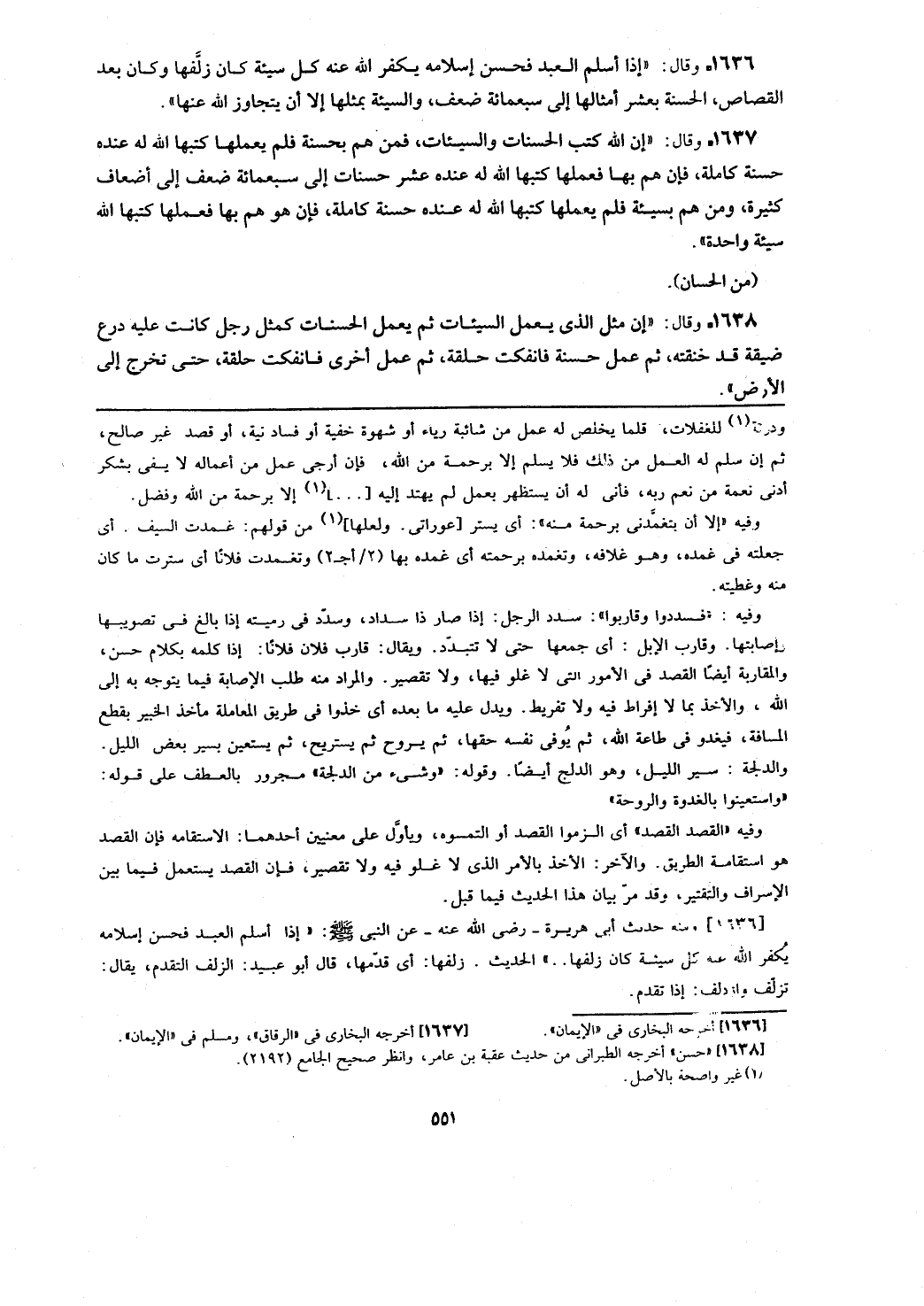 وفيه: (فسدوا وقاربوا): سدد الرجل: إذا صار ذا سداد، وسدد في رميته إذا بالغ في تصويبها وإصابتها. وقارب الإبل: أي جمعها حتى لا تتبدد. ويقال: قارب فلان فلاناً: إذا كلمه بكلام حسن، والمقاربة أيضاً القصد في الأمور التي لا غلو فيها، ولا تقصير. والمراد منه طلب الإصابة فيما يتوجه به إلى الله، والأخذ بما لا إفراط فيه ولا تفريط. ويدل عليه ما بعده أي خذوا في طريق المعاملة مأخذ الخبير بقطع المسافة، فيغدو في طاعة الله، ثم يوفى نفسه حقها، ثم يروح ثم يستريح، ثم يستعين بسير بعض الليل. والدلجة: سير الليل، وهو الدرج أيضاً. قوله: (وشيء من الدلجة) مجرور بالعطف على قوله: (واستعينوا بالغدوة والروحة)