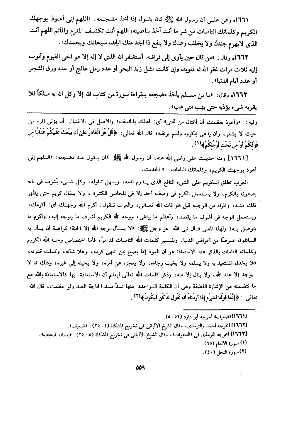 [1661] ومنه حديث علي رضي الله عنه، أن رسول الله - صلى الله عليه وسلم - كان يقول عند مضجعه: (اللهم إني أعوذ بوجهك الكريم، وكلماتك التامات ..) الحديث.