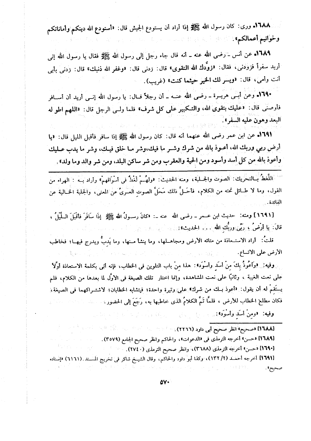 [1691] ومنه: حديث ابن عمر- رضي الله عنه-: (كان رسول الله - صلى الله عليه وسلم - إذا سافر فأقبل الليل، قال: يا أرض، ربي وربك الله ... الحديث):