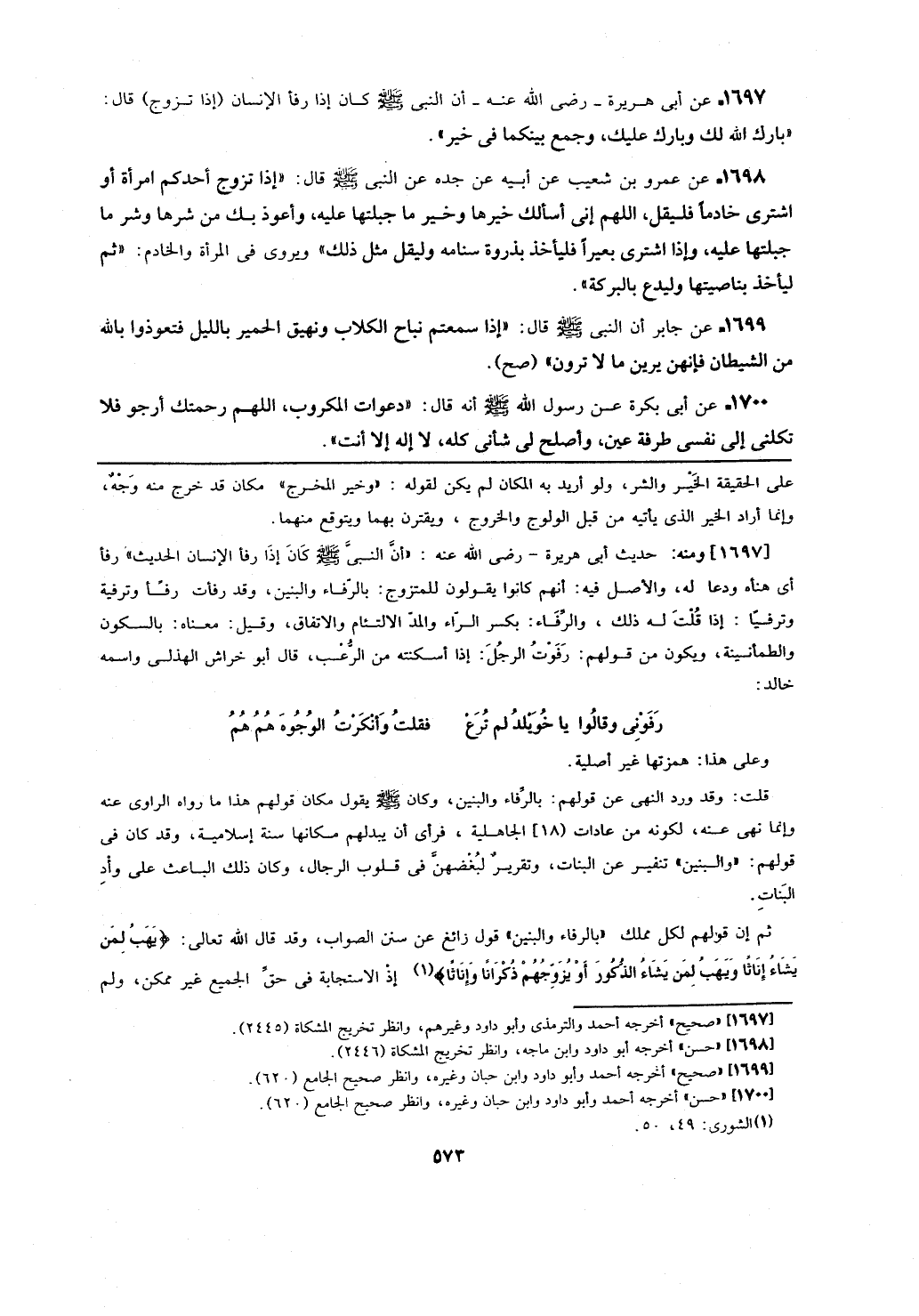 قلت: وقد ورد النهي عن قولهم: بالرفاء والبنين، وكان - صلى الله عليه وسلم - يقول مكان قولهم هذا ما رواه الراوي عنه وإنما نهى عنه، لكونه من عادات (18] الجاهلية، فرأى أن يبدلهم مكانها سنة إسلامية، وقد كان في قولهم: (والبنين) تنفير عن البنات، وتقري لبغضهن في قلوب الرجال، وكان ذلك الباعث على وأد البنات.