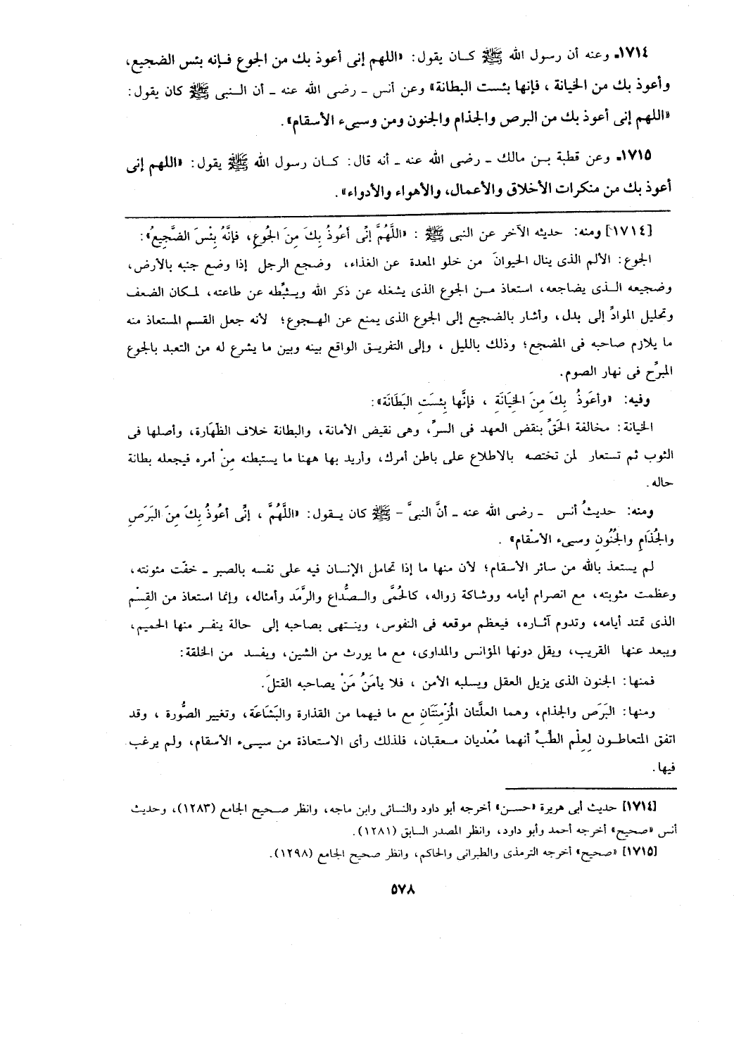 ومنها: البرص والجذام، وهما العلتان المزمنتان مع ما فيهما من القذارة والبشاعة، وتغيير الصورة، وقد اتفق المتعاطفون لعلم الطب أنهما معديان معقبان، فلذلك رأى الاستعاذة من سيء الاسقام، ولم يرغب فيها.