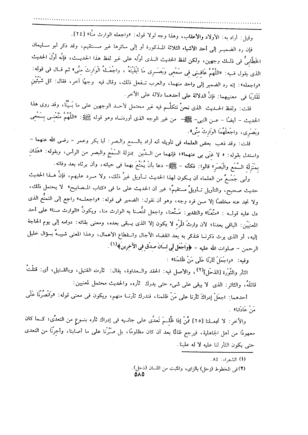 وأبى جمع من العلماء أن يكن لهذا الحديث تأويل غير ذلك، ولا مرد عليهم، فإن هذا الحديث حديث صحيح، والتأويل مستقيم؛ غير أن الحديث على ما في (كتاب المصابيح) لا يحتمل ذلك، ولا نجد عنه مخلصاً إلا من فرد وجه، وهو أن نقول: الضمير في قوله: (واجعله) راجع إلى التمتع الذي دل عليه قوله: (متعنا) والتقدير: متعنا، واجعل تمتعنا به الوارث منا، ويكون (الوارث منا) على أحد المعنيين: الباقي بعدنا؛ لأن وارث المرء لا يكون إلا الذي يبقى بعده، ومعنى بقائه: دوامه إلى يوم الحاجة إليه، أو الذي يرث ذكرنا فنذكر به بعد انقضاء الآجال وانقطاع الأعمال، وهذا المعنى شبيه بسؤال خليل الرحمن- صلوات الله عليه- {واجعل لي لسان صدق في الآخرين}.