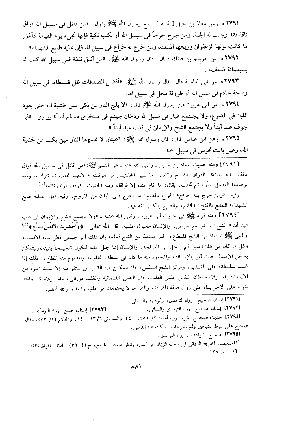 [2794] ومنه قوله - صلى الله عليه وسلم - في حديث أبي هريرة- رضي الله عنه- (ولا يجتمع الشح والإيمان في قلب عبد أبداً) الشح: بخل مع حرص، والإنسان مجبول عليه، قال الله تعالى: {وأحضرت الأنفس الشح} والنبي - صلى الله عليه وسلم - استعاذ من الشح المطاع، ولم يستعذ من الشح لعلمه بأن ذلك أمر جبلي فطر عليه الإنسان، وكل ما كان من هذا القبيل لم يخل من المصلحة. والإنسان إنما جبل عليه ليكون شحيحاً بدينه، وليتمكن به عن الإمساك حيث أمر بالإمساك، والمحمود منه ما كان في سلطان القلب، والمذموم منه المطاع، وذلك إذا غلب سلطانه على القلب، ومركز الشح النفس، فلا يتمكن من القلب ويستقر فيه إلا بعد خلوه من الإيمان؛ باستيلاء سلطان النفس على القلب، فإن النفس ظلمانية والقلب نوراني، واستيلاء كل واحد منهما على الآخر يدل على زوال صفة المضادة، والضدان لا يجتمعان في قلب واحد، والله أعلم.