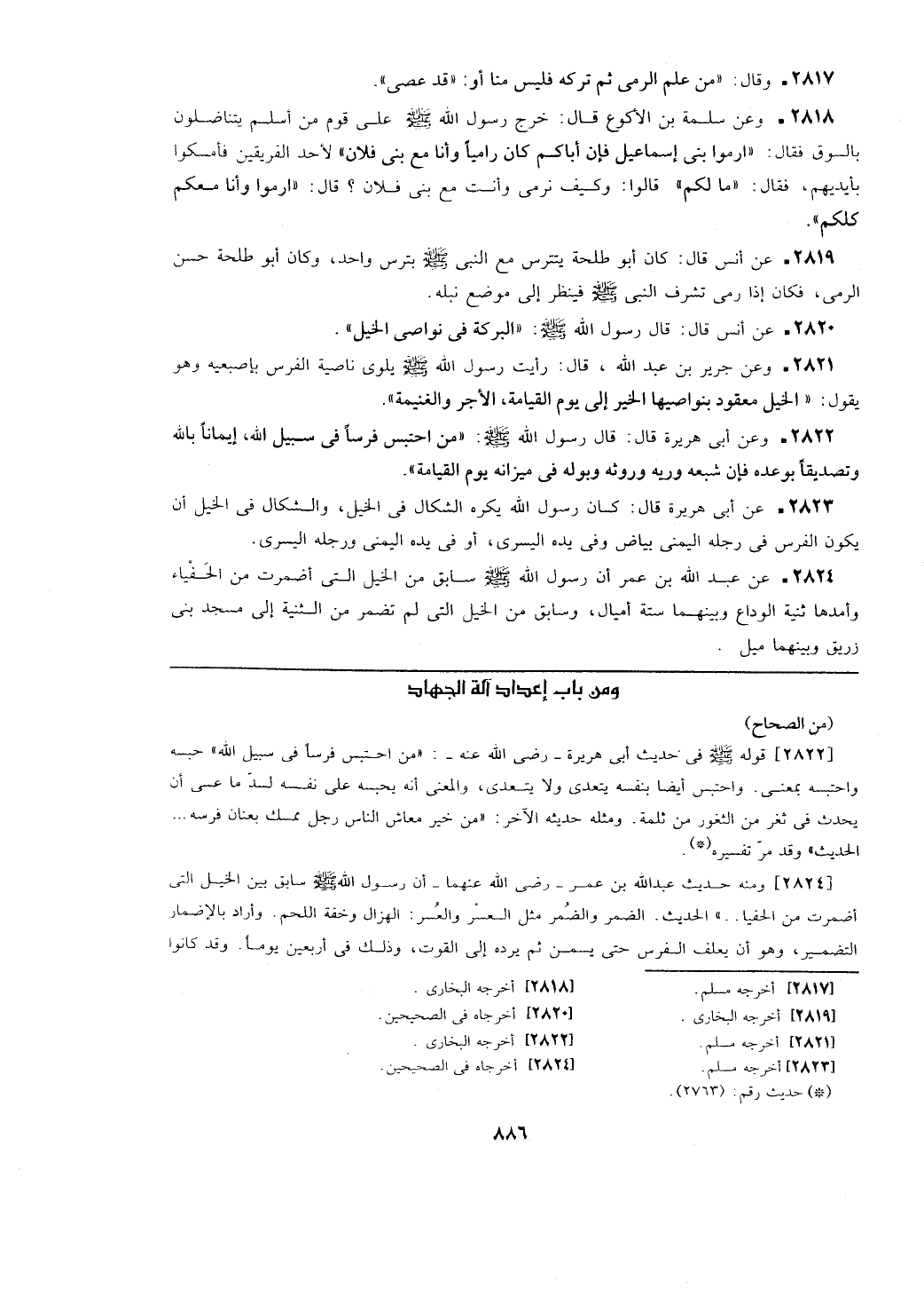 [2822] ومنه قوله - صلى الله عليه وسلم - في حديث أبي هريرة- رضي الله عنه-: (من احتبس فرساً في سبيل الله) حبسه واحتبسه بمعنى. واحتبس أيضاً بنفسه يتعدى ولا يتعدى، والمعنى أنه يحبسه على نفسه لسد ما عسى أن يحدث في ثغر من الثغور من ثلمة. ومثله حديثه الآخر: (من خير معاش الناس رجل ممسك بعنان فرسه .. الحديث) وقد مر تفسيره.