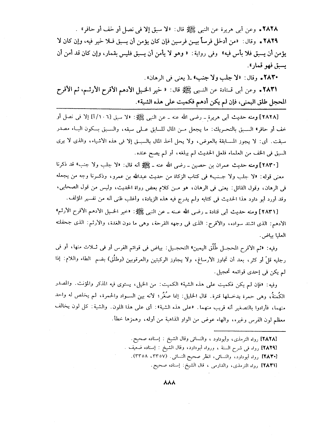 [2828] ومنه حديث أبي هريرة- رضي الله عنه- عن النبي - صلى الله عليه وسلم -: (لا سبق [106/أ] إلا في نصل أو خف أو حافر) السبق بالتحريك: ما يجعل من المال للسابق على سبقه، والسبق بسكون الباء مصدر سبقت. أي: لا يجوز مسابقة بالعوض، ولا يحل أخذ المال بالسبق إلا في هذه الأشياء، والذي لا يرى السبق في الخف من العلماء فلعل الحديث لم يبلغه، أو لم يصح عنده.