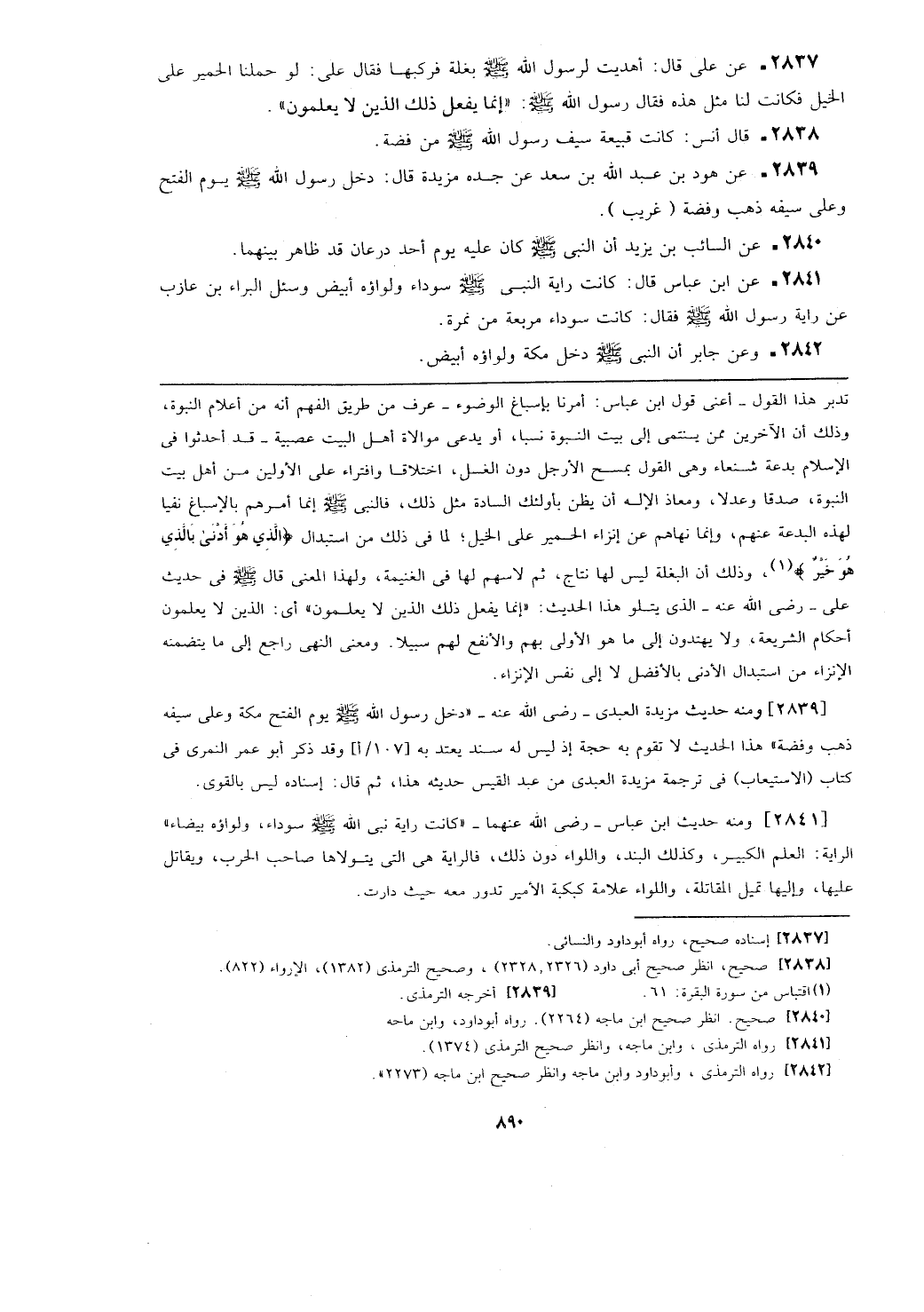 [2839] ومنه حيث مزيدة العبدي- رضى الله عنه - (دخل رسول الله - صلى الله عليه وسلم - يوم الفتح مكة وعلى سيفه ذهب وفضة) هذا الحديث لا تقوم به حجة إذ ليس له سند يعتد به [107/أ] وقد ذكر أبو عمر النمري فى كتاب (الاستيعاب) فى ترجمة مزيدة العبدي من عبد القيس حديثه هذا، ثم قال: إسناده ليس بالقوى.