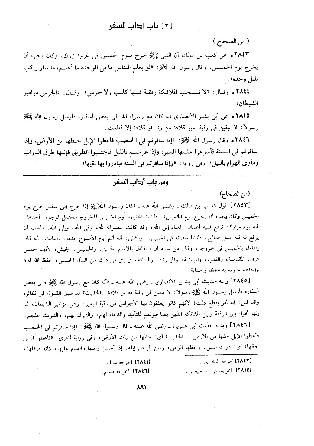 [2845] ومنه حديث أبى بشير الأنصارى - رضى الله عنه - (أنه كان مع رسول الله - صلى الله عليه وسلم - فى بعض أسفاره فأرسل رسول الله - صلى الله عليه وسلم - رسولا: لا يبقين فى رقية بعير قلادة. .الحديث) قد سبق القول فى نظائره وقد قيل: إنه أمر بقطع ذلك؛ لأنهم كانوا يعلقون بها الأجراس من رقبة البعير، وهى مزامير الشيطان، ثم إنها تحول بين الرفقة وبين الملائكة الذين يصاحبونهم للتأييد والدعاء لهم، والتبرك بهم، والتبريك عليهم.