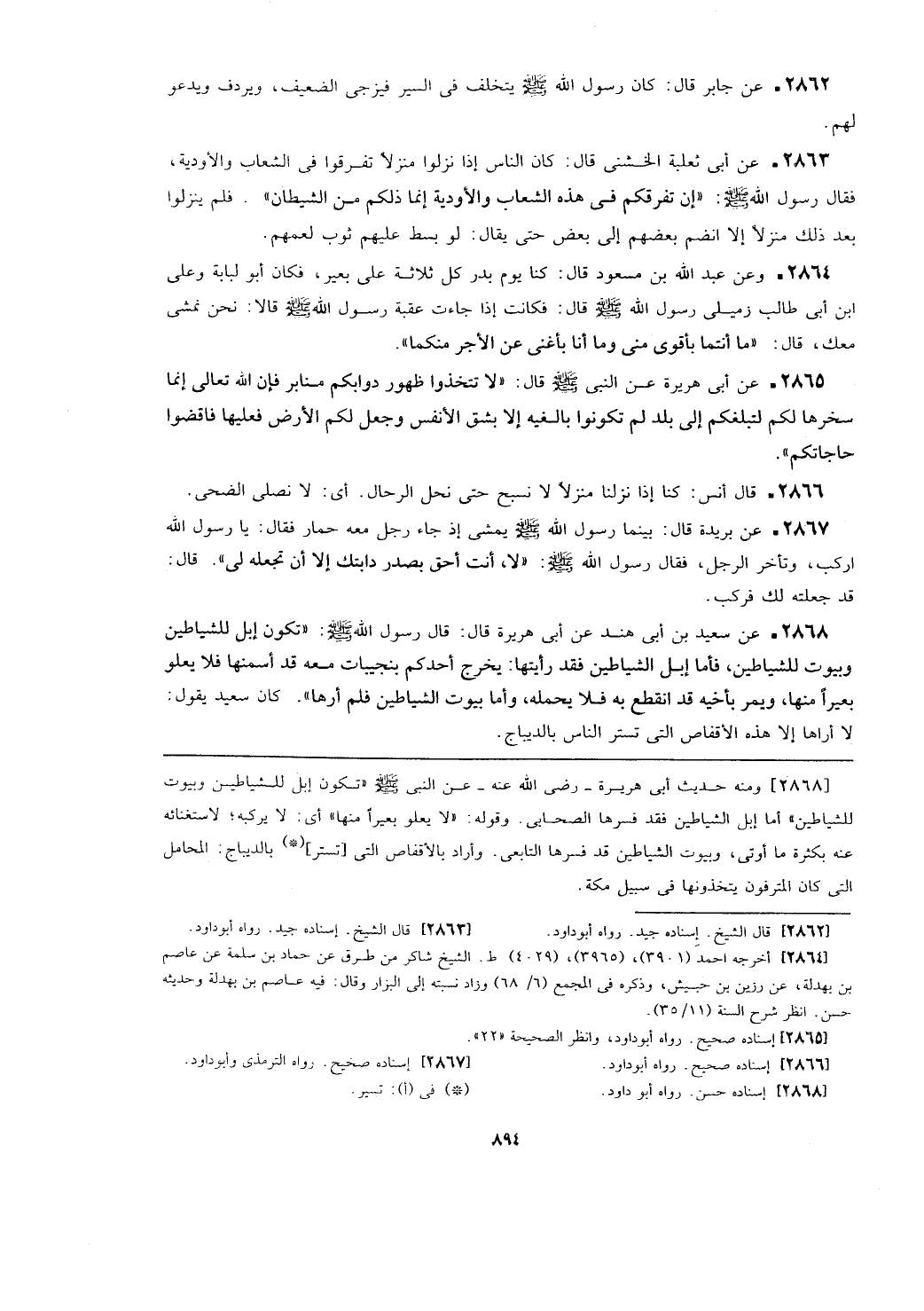 [2868] ومنه حديث أبى هريرة- رضى الله عنه- عن النبي - صلى الله عليه وسلم -: (تكون إبل للشياطين وبيوت للشياطين) أما إبل الشياطين فقد فسرها الصحابي. وقوله: (لا يعلو بعيراً منها) أي: لا يركبه؛ لاستغنائه عنه بكثرة ما أوتى، وبيوت الشياطين قد فسرها التابعي. وأراد بالأقفاص التي [تستر] بالديباج: المحامل التي كان المترفون يتخذونها في سبيل مكة.