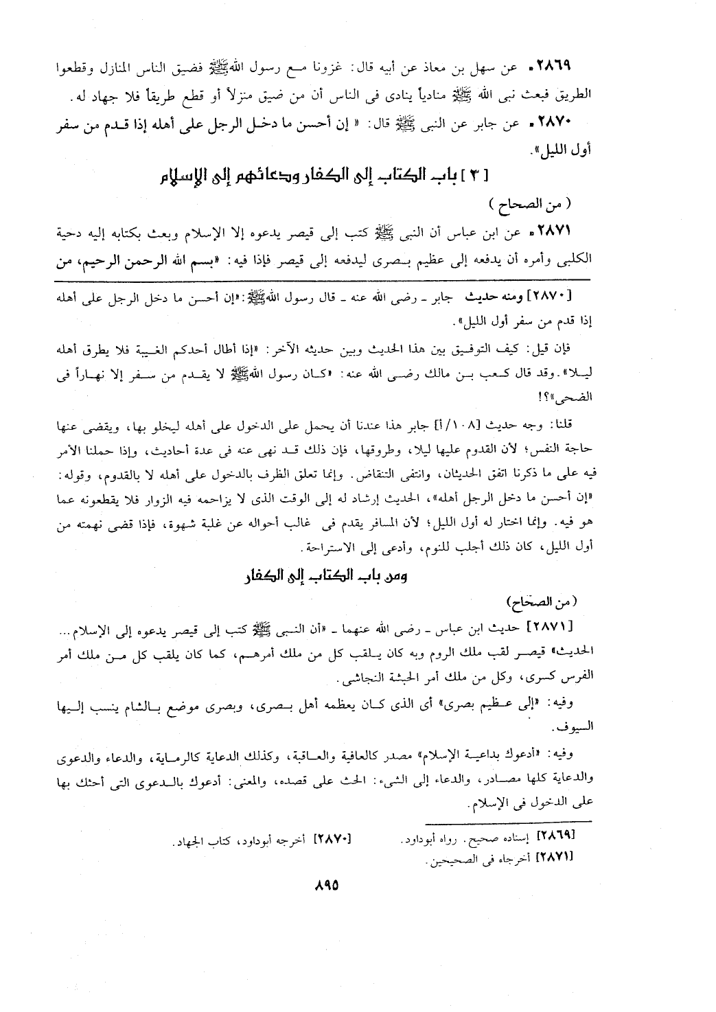 [2870] ومنه حديث جابر- رضى الله عنه- قال رسول الله - صلى الله عليه وسلم -: (إن أحسن ما دخل الرجل على أهله إذا قدم من سفر أول الليل)