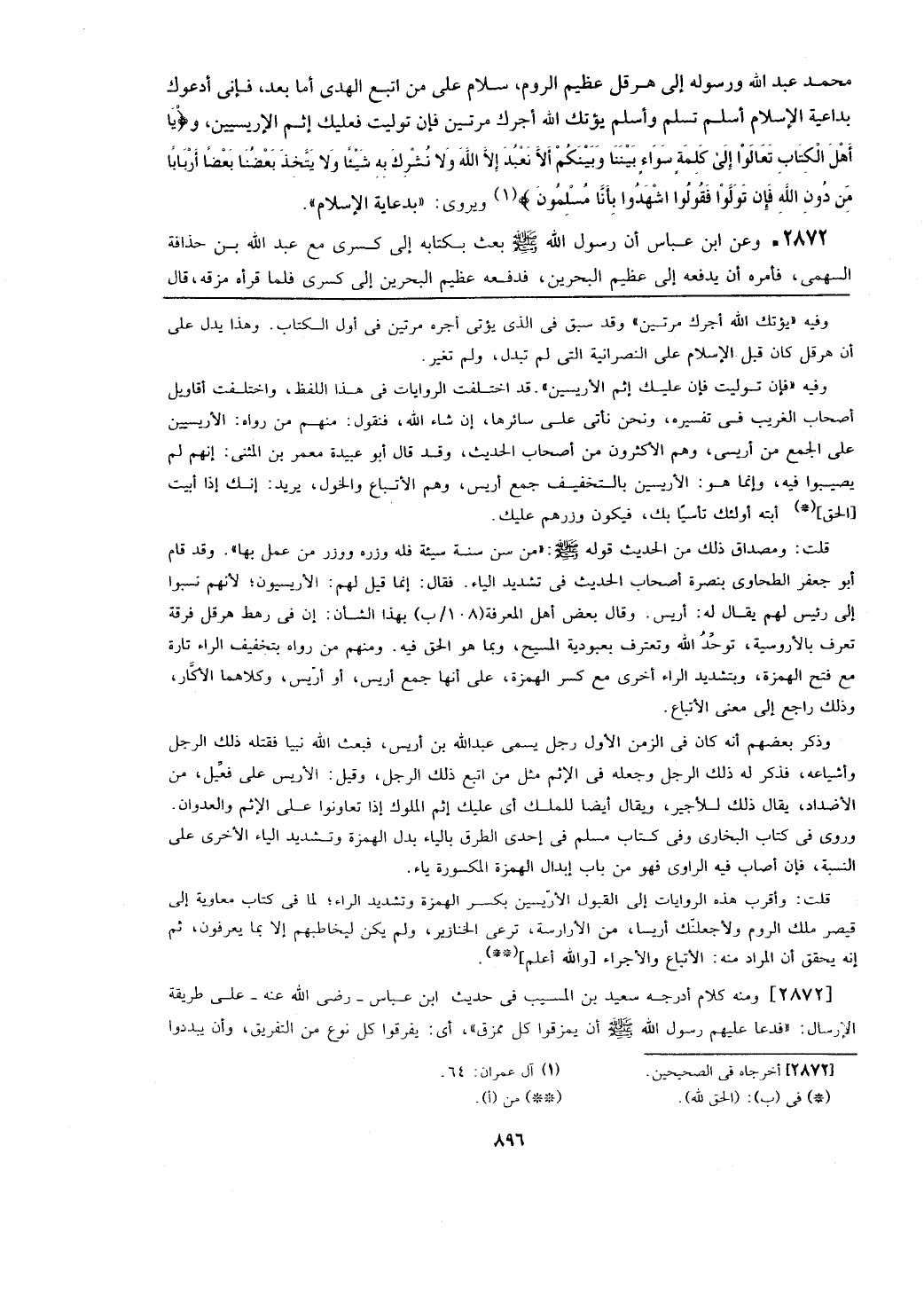 قلت: وأقرب هذه الروايات إلى القبول الأريسين بكسر الهمزة وتشديد الراء؛ لما في كتاب معاوية إلى قيصر ملك الروم ولأجعلنك أريسا، من الأرارسة، ترعى الخنازير، ولم يكن ليخاطبهم إلا بما يعرفون، ثم إنه يحقق أن المراد منه: الأتباع والأجراء [والله أعلم]