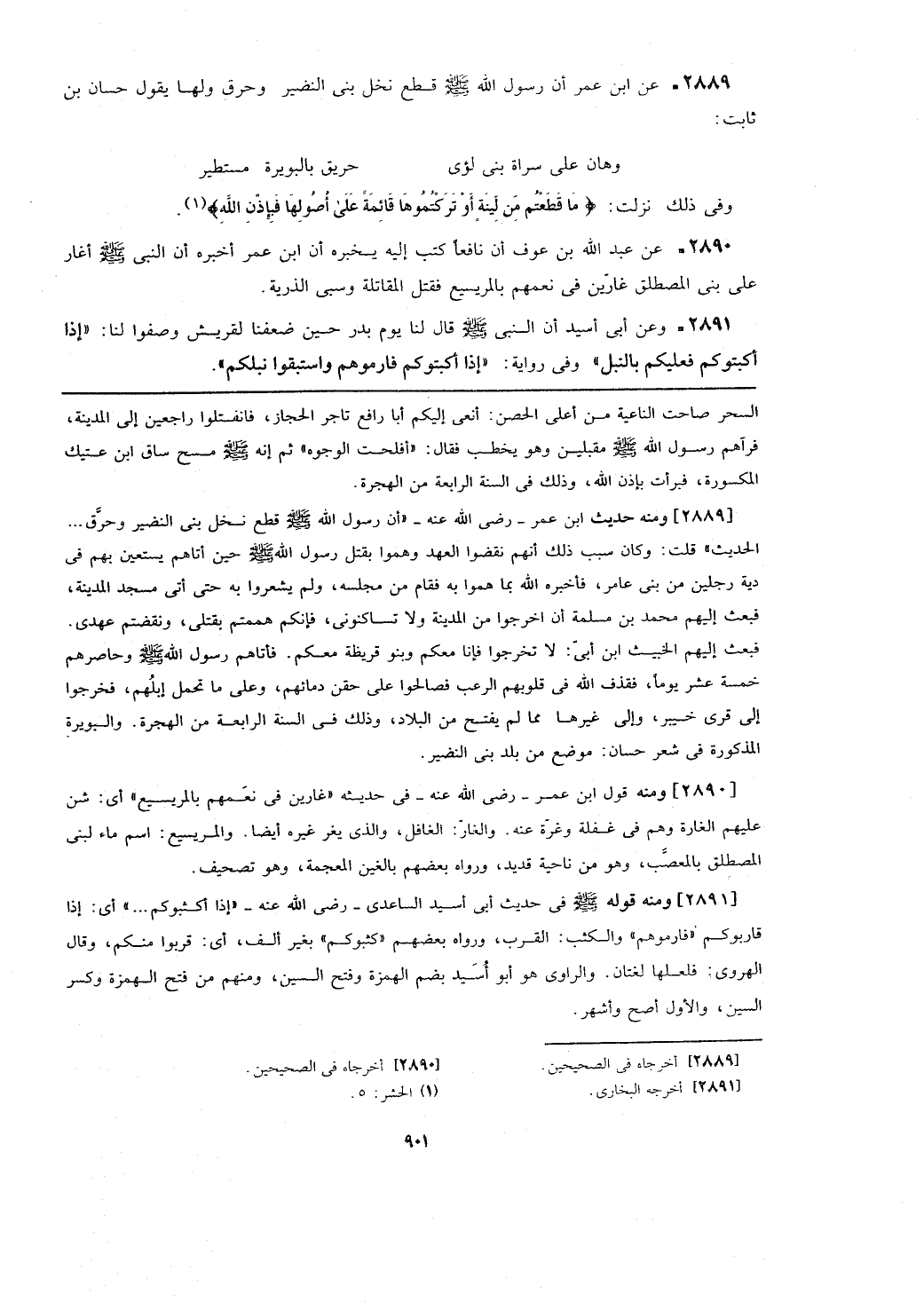 [2889] ومنه حديث ابن عمر - رضي الله عنه- (أن رسول الله - صلى الله عليه وسلم - قطع نخل بني النضير وحرق ... الحديث) قلت: وكان سبب ذلك أنهم نقضوا العهد وهموا بقتل رسول الله - صلى الله عليه وسلم - حين أتاهم يستعين بهم في دبة رجلين من بني عامر، فأخبره الله بما هموا به فقام من مجلسه، ولم يشعروا به حتى أتى مسجد المدينة، فبعت إليهم محمد بن مسلمة أن اخرجوا من المدينة ولا تساكنوني، فإنكم هممتم بقتلي، ونقضتم عهدي.