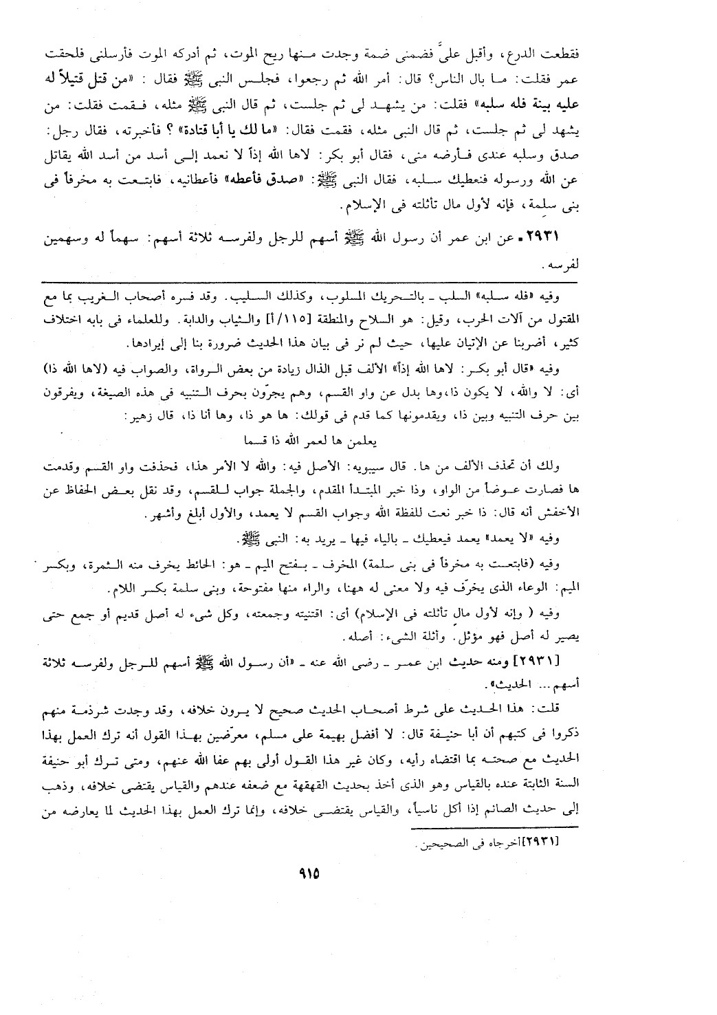 [2913] ومنه حديث ابن عمر - رضي الله عنه - (فإن رسول الله - صلى الله عليه وسلم - أسهم للرجل ولفرسه ثلاثة أسهم ... الحديث)