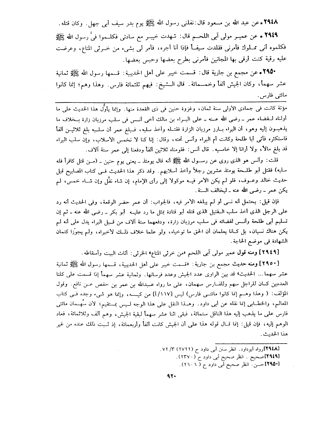 قلت وأنس هو الذي روى عن رسول الله - صلى الله عليه وسلم - أنه قال يومئذ - يعني يوم حنين - (من قتل كافرا فله سلبه) فقتل أبو طلحه يومئذ عشرين رجلا وأخذ أسلابهم. وقد ذكر هذا الحديث في كتاب المصابيح قبل حديث خال وعوف، فلو لم يكن الأمر فيه موكلا إلى رأي الإمام، أن شاء الله نفل وإن شاء خمس، لم يكن عمر- رضي الله عنه - ليخالف السنة.