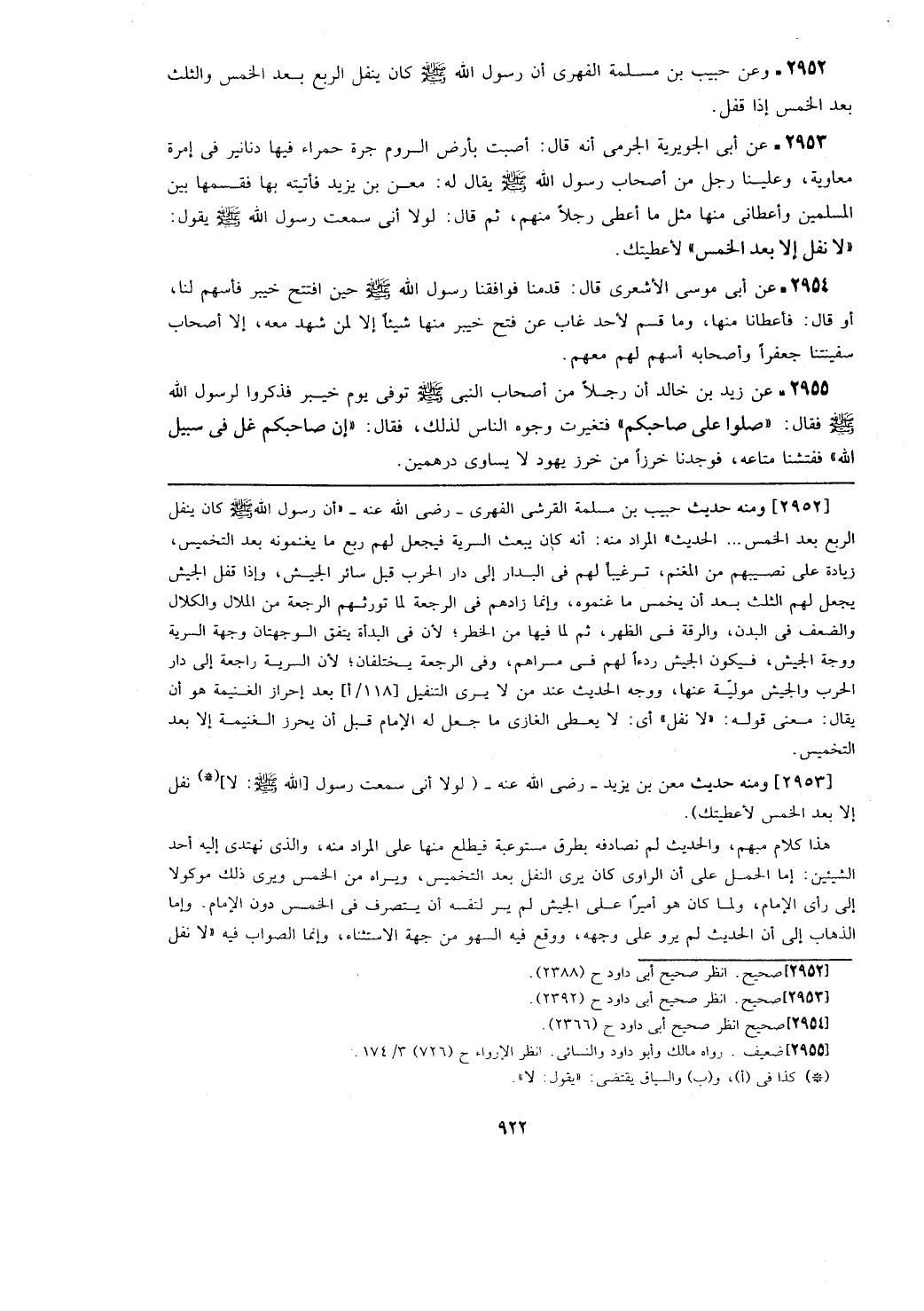[2952] ومنه حديث حبيب بن مسلمة القرشي الفهري - رضي الله عنه - (أن رسول الله - صلى الله عليه وسلم - كان ينفل الربع بعد الخمس ... الحديث) المراد منه: أنه كان يبعث السرية فيجعل لهم ربع ما يغنمونه بعد التخميس، زيادة على نصيبهم من المغنم، ترغيبا لهم في البدار إلى دار الحرب قبل سائر الجيش، وإذا قفل الجيش يجعل لهم الثلث بعد أن يخمس ما غنموه، وإنما زادهم في الرجعة لما تورثهم الرجعة من الملال والكلال والضعف في البدن، والرقة في الظهر، ثم لما فيها من الخطر؛ لأن في البدأة يتفق الوجهتان وجهة السرية ووجه الجيش، فيكون الجيش ردءا لهم في مسراهم، وفي الرجعة يختلفان؛ لأن السرية راجعة إلى دار الحرب والجيش مولية عنها، ووجه الحديث عند من لا يرى التنفيل [118/أ] بعد إحراز الغنيمة هو أن يقال: معنى قوله: (لا نفل) أي: لا يعطى الغازي ما جعل له الإمام قبل أن يحرز الغنيمة إلا بعد التخميس.