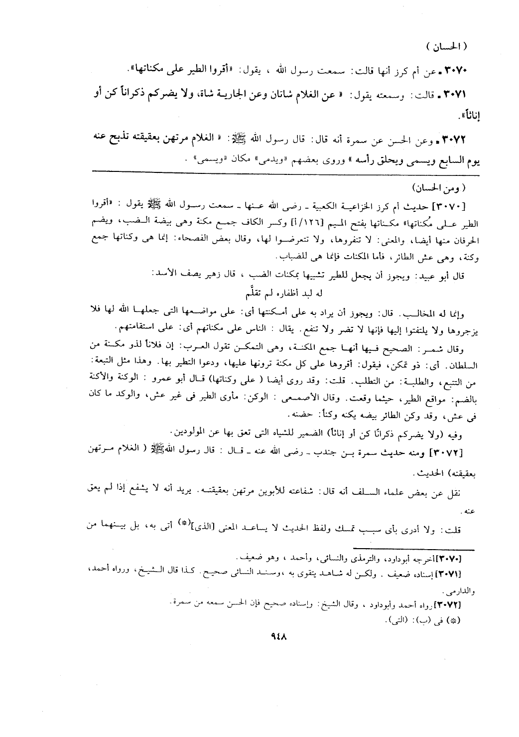 [3072] ومنه حديث سمرة بن جندب - رضي الله عنه - قال: قال رسول الله ? (الغلام مرتهن بعقيقته) الحديث.