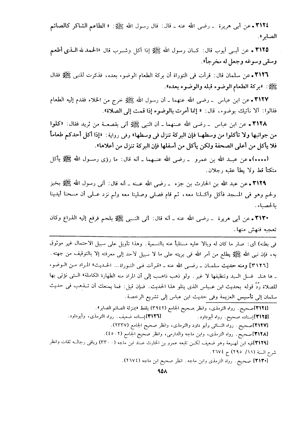 [3126] ومنه حديث سلمان- رضي الله عنه- (قرأت في التوراة ... الحديث) المراد من الوضوء- ها هنا- غسل اليد وتنظيفها لا غير. ولو ذهب ذاهب إلى أن المراد منه الطهارة الكاملة) التي نؤتي بها للصلاة رد قوله بحديث ابن عباس الذي يتلو هذا الحديث. فإن قيل: فما يمنعك أن تذهب في حديث سلمان إلى تأسيس العزيمة وفي حديث ابن عباس إلى تشريع الرخصة.