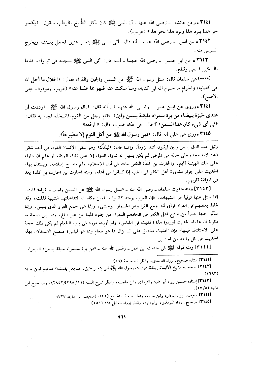 [3143] ومنه حديث سلمان- رضي الله عنه- (سئل رسول الله - صلى الله عليه وسلم - عن السمن والجبن والفراء) قلت: إنما سئل عنها توقيا عن الشبهات، فإن العرب يومئذ كانوا مسلمين وكفارا، فتداخلهم الشبهة لذلك، وقد غلط بعضهم في الفراء فرأى أنه جمع الفرا وهو الحمار الوحشي، وإنما هي جمع الفرو الذي يلبس. وإنما سألوا عنها حذرا من صنيع أهل الكفر في اتخاذهم الفراء من جلود الميتة من غير دباغ، ومما يبين صحة ما ذكرنا أن علماء الحديث أوردوا هذا الحديث في اللباس، ولو أورده مورد في باب الطعام لم يكن ذلك حجة على الاختلاف فيها؛ فإن الحديث مشتمل على السؤال مما هو طعام ومما هو لباس؛ فصح الاستدلال بهذا الحديث في كل واحد من الجنسين.