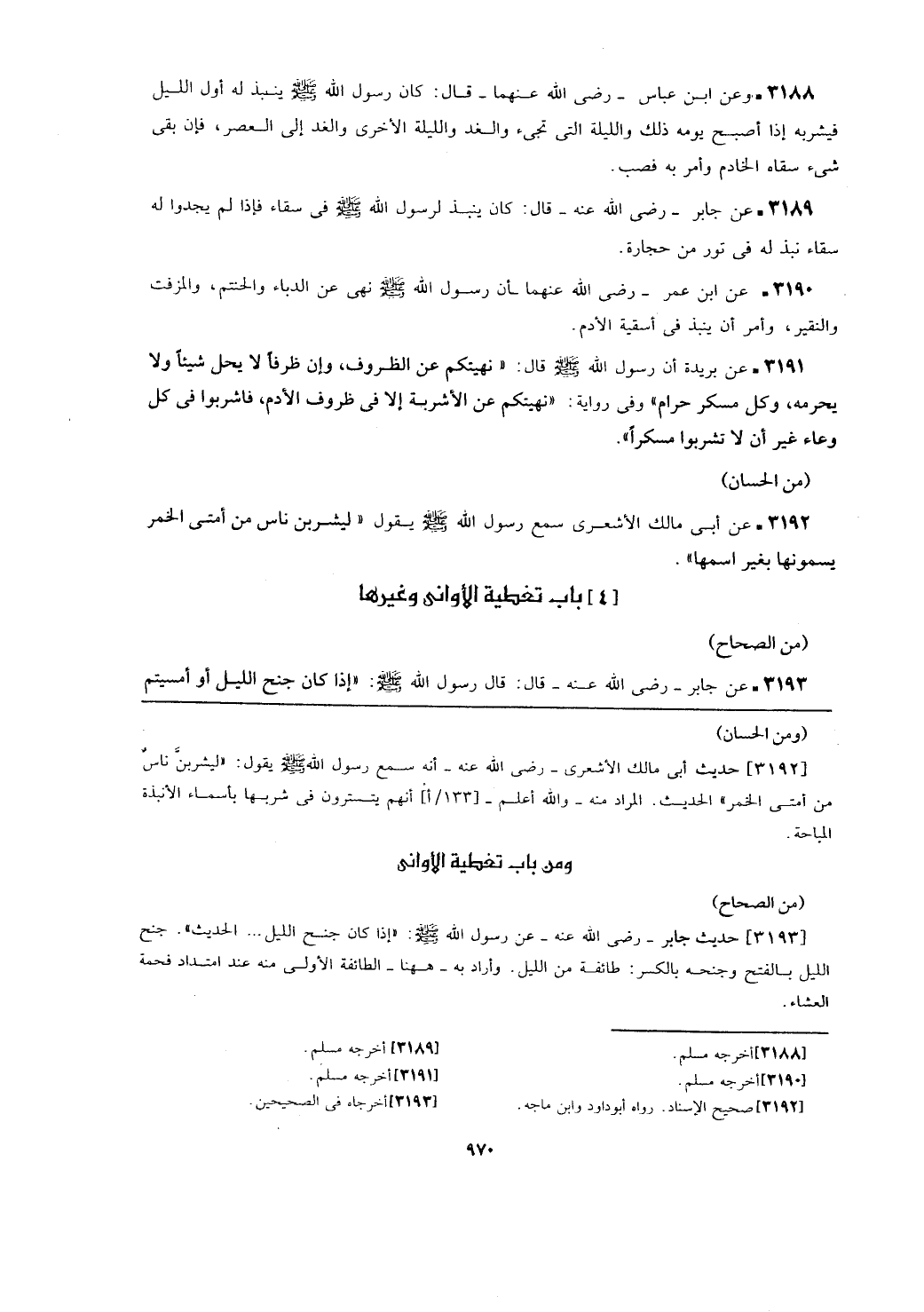 [3193] حديث جابر- رضي الله عنه- عن رسول الله - صلى الله عليه وسلم -: (إذا كان جنح الليل ... الحديث). جنح الليل بالفتح وجنحه بالكسر: طائفة من الليل. وأراد به- ههنا- الطائفة الأولى منه عند امتداد فحمة العشاء.