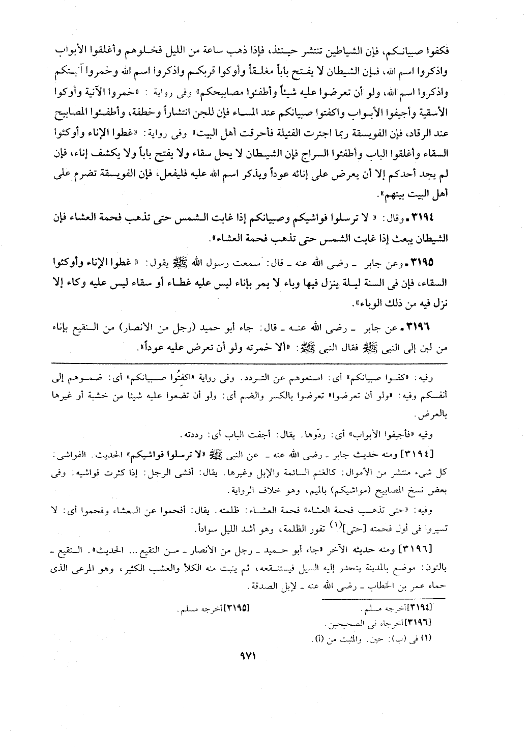 وفيه: (كفوا صبيانكم) أي: امنعوهم عن التردد. وفي رواية (اكفتوا صبيانكم) أي: ضموهم غلى أنفسكم وفيه: (ولو أن تعرضوا) تعرضوا بالكسر والضم أي: ولو أن تضعوا عليه شيئا من خشبة أو غيرها بالعرض.