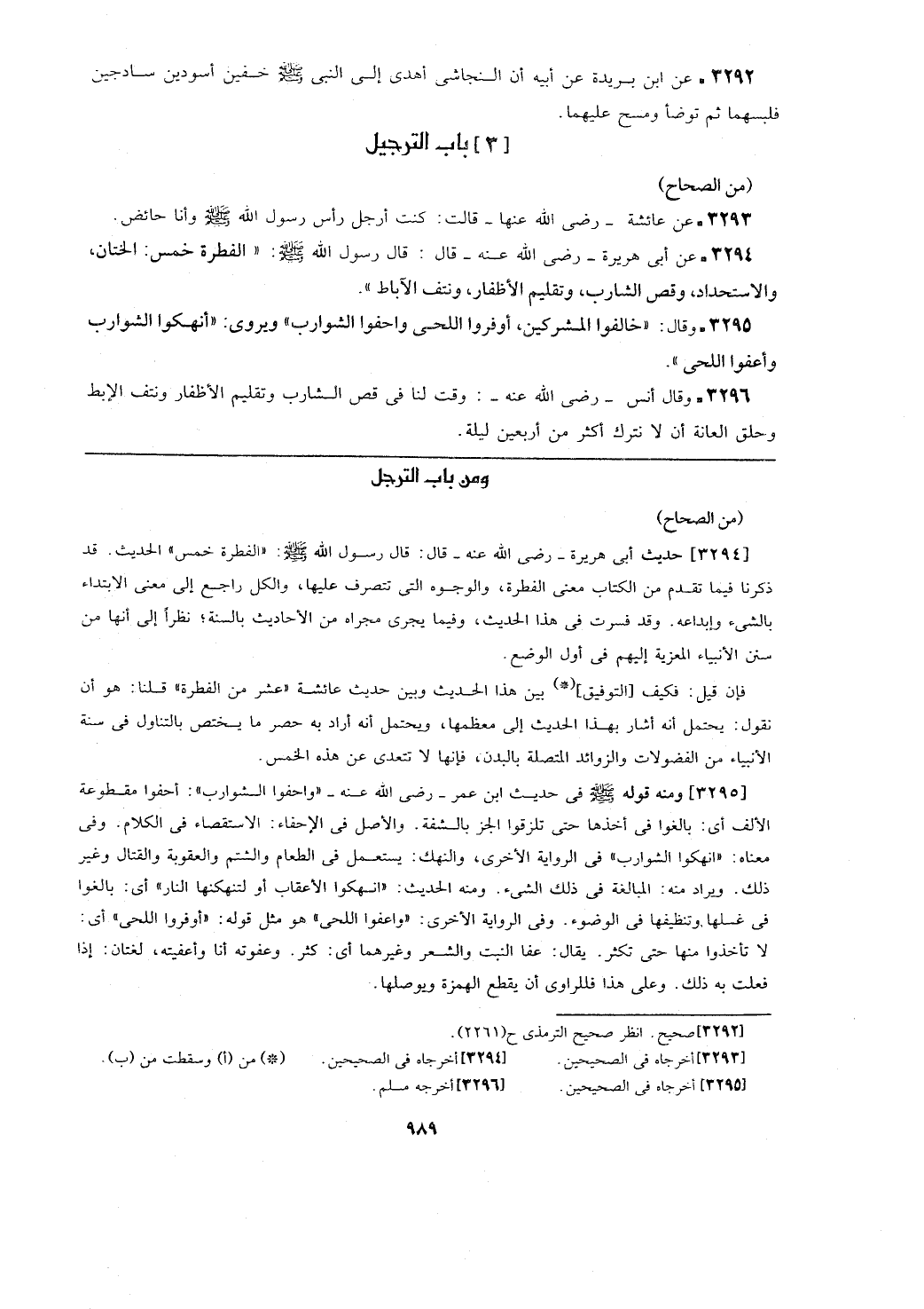 (من الصحاح) [3294] حديث أبي هريرة- رضي الله عنه- قال: قال رسول الله - صلى الله عليه وسلم -: (الفطرة خمس) الحديث. قد ذكرنا فيما تقدم من الكتاب معنى الفطرة، والوجوه التي تتصرف عليها، والكل راجع إلى معنى الابتداء بالشيء وإبداعه. وقد فسرت في هذا الحديث، وفيما يجري مجراه من الأحاديث بالسنة؛ نظرا إلى أنها من سنن الأنبياء المعزبة إليهم في أول الوضع.