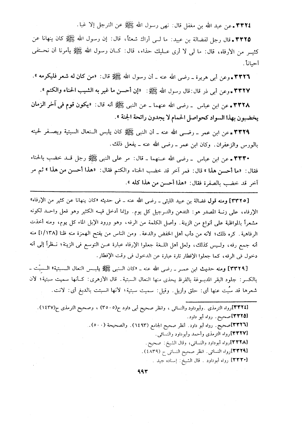 [3325] ومنه قول فضالة بن عبيد الليثي- رضي الله عنه- في حديثه (كان ينهانا عن كثير من الإرفاه) الإرفاه، على زنة المصدر هو: التدهن والترجيل كل يوم. وإنما أدخل فيه الكثير وهو فعل واحد لكونه مشعرا بالمواظبة على أنواع من الزينة. وأصل الكلمة من الرفه، وهو ورود الإبل الماء كل يوم، ومنه أخذت الرفاهية. كره ذلك؛ لأنه من دأب أهل الخفض والدعة. ومن الناس من يفتح الهمزة منه ظنا [138/أ] منه أنه جمع رفه، وليس كذلك، ولعل أهل اللغة جعلوا الإرفاه عبارة عن التوسع في الزينة؛ نظرا إلى أنه دخول في الرفه، كما جعلوا الإفطار تارة عبارة عن الدخول في وقت الإفطار.