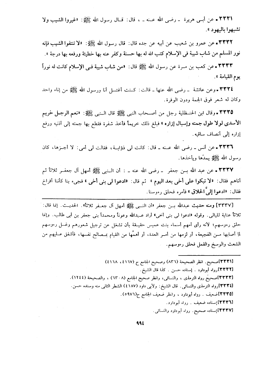 [3337] ومنه حديث عبد الله بن جعفر (أن النبي - صلى الله عليه وسلم - أمهل آل جعفر ثلاثا). الحديث. إنما قال: ثلاثا عناية لليالي. وقوله (ادعوا لي بني أخي) أراد عبد الله وعونا ومحمدا بني جعفر بن أبي طالب. وإنما حلق رءوسهم؛ لأنه رأى أمهم أسماء بنت عميس حقيقة بأن تشغل عن ترجيل شعورهم وغسل رءوسهم لما أصابها من الفجيعة، أو لزمها من أمر العدة، أو أهمها من القيام بمصالح نفسها، فأشفق عليهم من الشعث والوسخ والقمل فحلق رءوسهم.