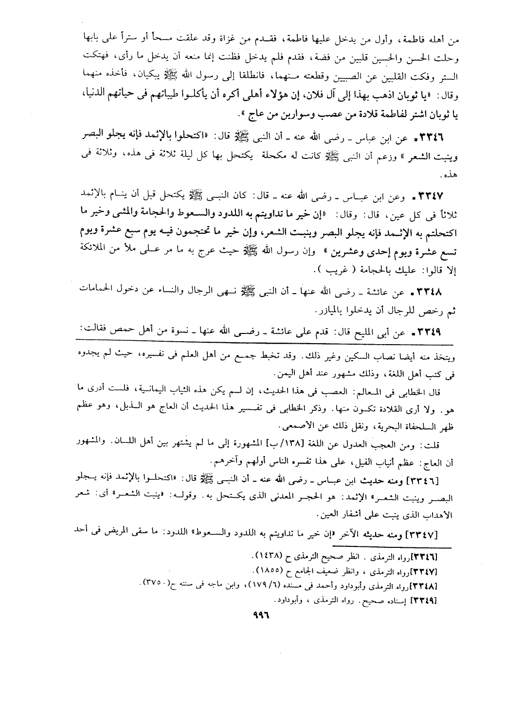 [3346] ومنه حديث ابن عباس- رضي الله عنه- أن النبي - صلى الله عليه وسلم - قال: (اكتحلوا بالإثمد فإنه يجلو البصر وينبت الشعر) الإثمد: هو الحجر المعدني الذي يكتحل به. وقوله: (ينبت الشعر) أي: شعر الأهداب الذي ينبت على أشفار العين.