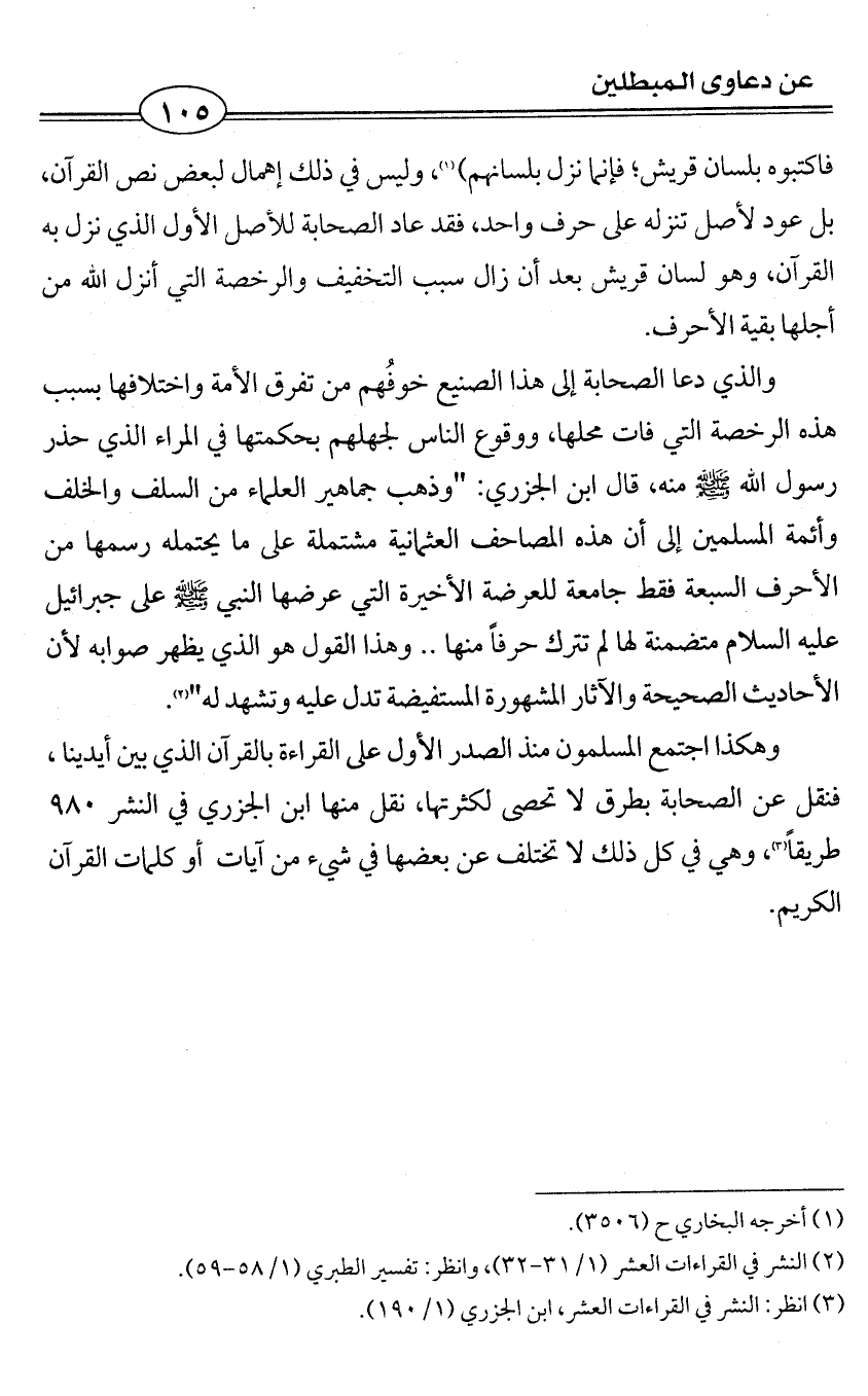 وهكذا اجتمع المسلمون منذ الصدر الأول على القراءة بالقرآن الذي بين أيدينا، فنقل عن الصحابة بطرق لا تحصى لكثرتها، نقل منها ابن الجزري في النشر 980 طريقاً (¬3)، وهي في كل ذلك لا تختلف عن بعضها في شيء من آيات أو كلمات القرآن الكريم.
