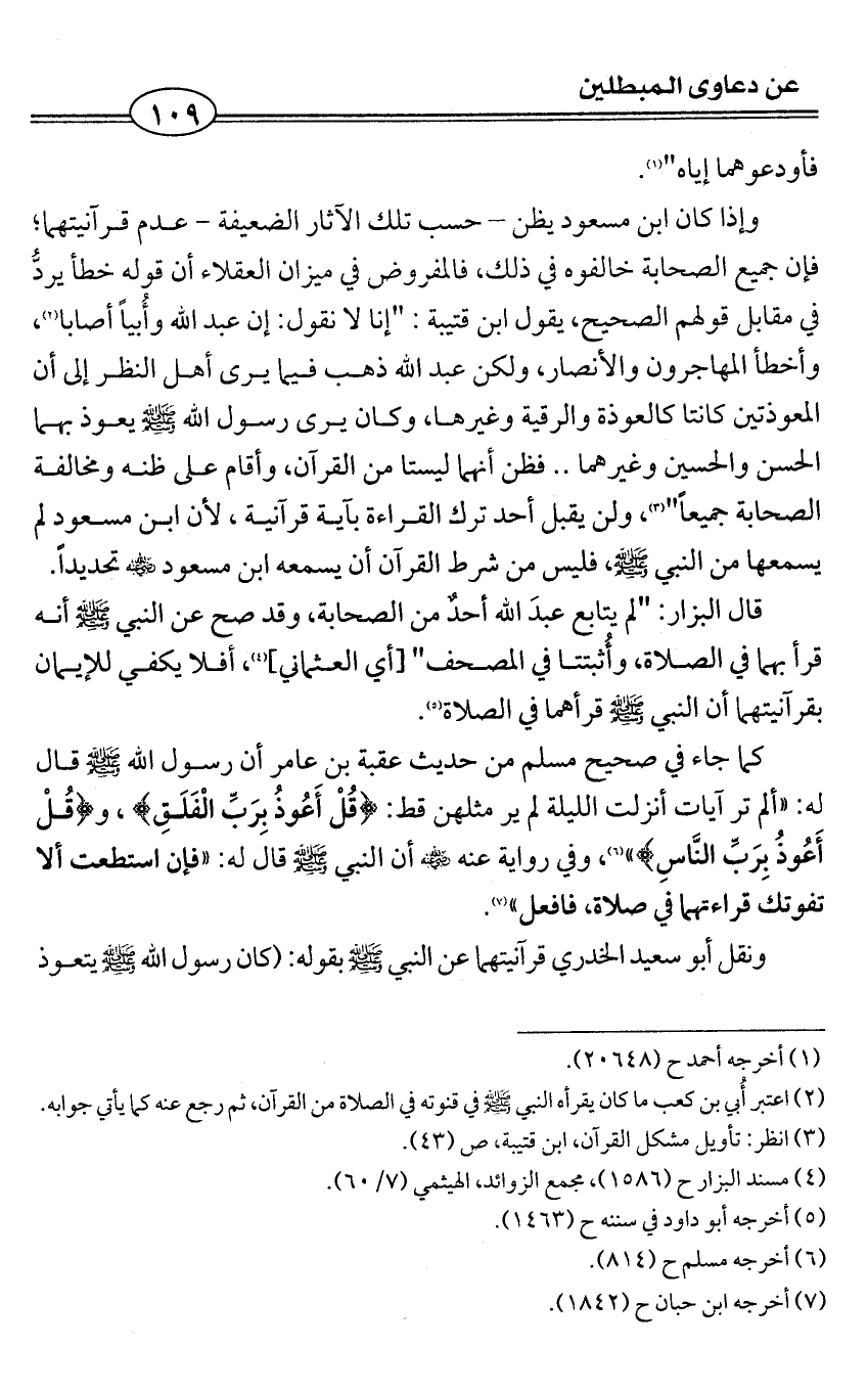 قال البزار: "لم يتابع عبدَ الله أحدٌ من الصحابة، وقد صح عن النبي - صلى الله عليه وسلم - أنه قرأ بهما في الصلاة، وأُثبتتا في المصحف" [أي العثماني] (¬4)، أفلا يكفي للإيمان بقرآنيتهما أن النبي - صلى الله عليه وسلم - قرأهما في الصلاة (¬5).