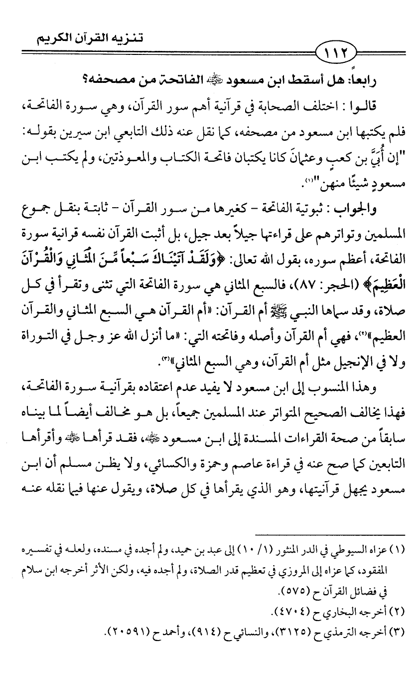 رابعاً: هل أسقط ابن مسعود - رضي الله عنه - الفاتحة من مصحفه؟