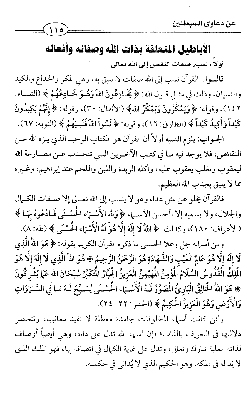 فالقرآن يخلو عن مثل هذا، وهو لا ينسب إلى الله تعالى إلا صفات الكمال والجلال، ولا يسميه إلا بأحسن الأسماء {وَلِله الأَسْمَاء الْحُسْنَى فَادْعُوهُ بِهَا} (الأعراف: 180)، وكذلك: {اللهُ لَا إِلَهَ إِلَّا هُوَ لَهُ الْأَسْمَاء الْحُسْنَى} (طه: 8).