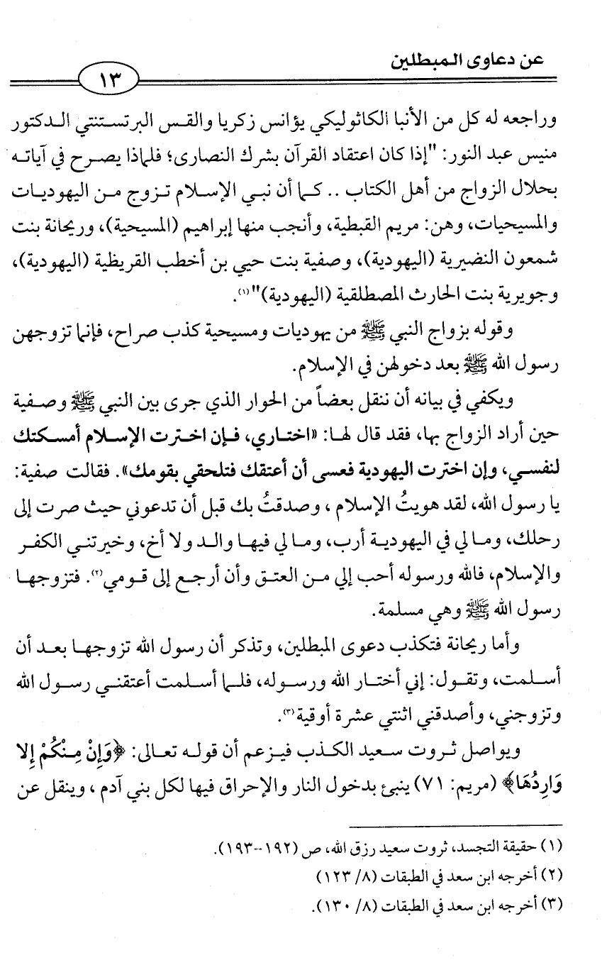 وراجعه له كل من الأنبا الكاثوليكي يؤانس زكريا والقس البرتستنتي الدكتور منيس عبد النور: "إذا كان اعتقاد القرآن بشرك النصارى؛ فلماذا يصرح في آياته بحلال الزواج من أهل الكتاب .. كما أن نبي الإسلام تزوج من اليهوديات والمسيحيات، وهن: مريم القبطية، وأنجب منها إبراهيم (المسيحية)، وريحانة بنت شمعون النضيرية (اليهودية)، وصفية بنت حيي بن أخطب القريظية (اليهودية)، وجويرية بنت الحارث المصطلقية (اليهودية) " (¬1).