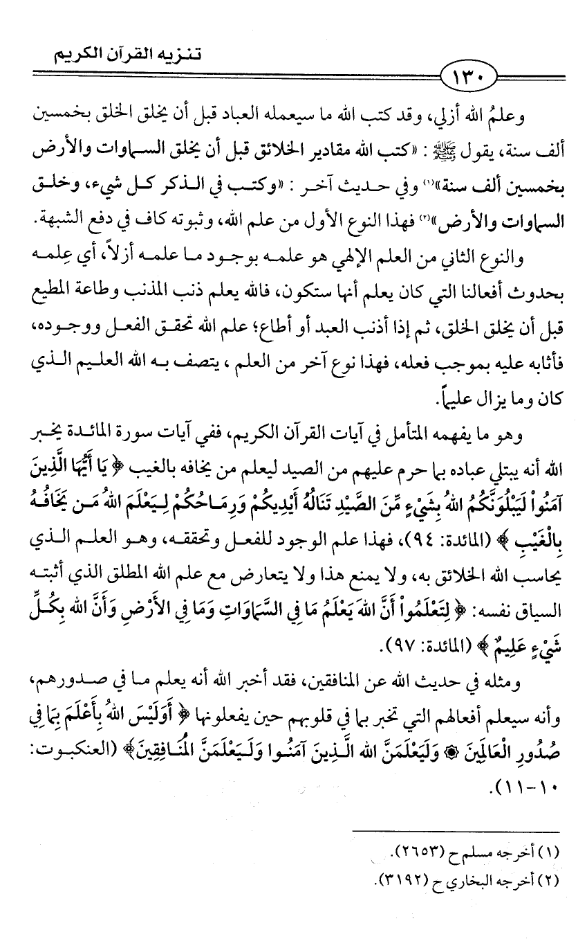 وعلمُ الله أزلي، وقد كتب الله ما سيعمله العباد قبل أن يخلق الخلق بخمسين ألف سنة، يقول - صلى الله عليه وسلم -: «كتب الله مقادير الخلائق قبل أن يخلق السماوات والأرض بخمسين ألف سنة» (¬1) وفي حديث آخر: «وكتب في الذكر كل شيء، وخلق السماوات والأرض» (¬2) فهذا النوع الأول من علم الله، وثبوته كاف في دفع الشبهة.