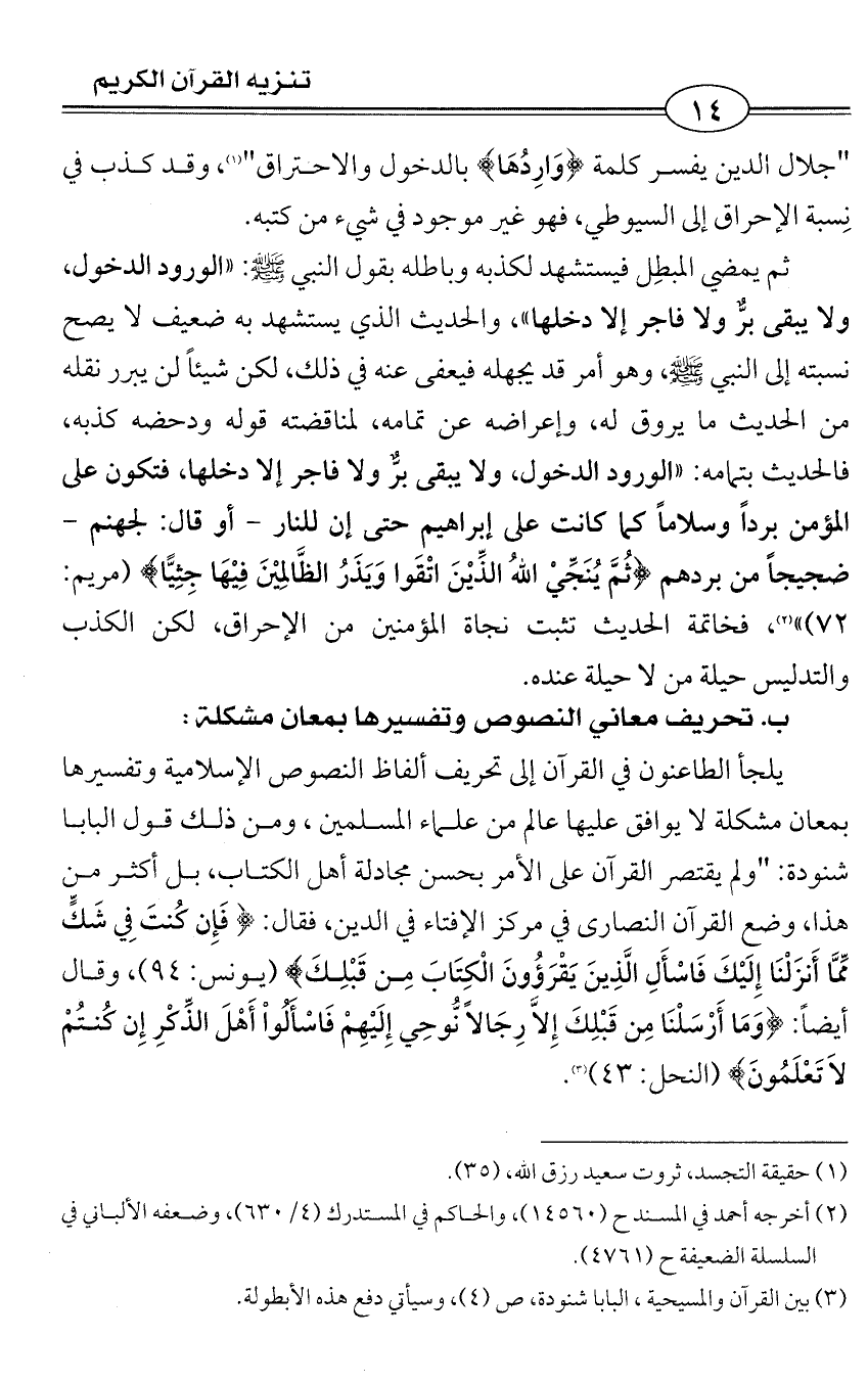 "جلال الدين يفسر كلمة {وَارِدُهَا} بالدخول والاحتراق" (¬1)، وقد كذب في نِسبة الإحراق إلى السيوطي، فهو غير موجود في شيء من كتبه.