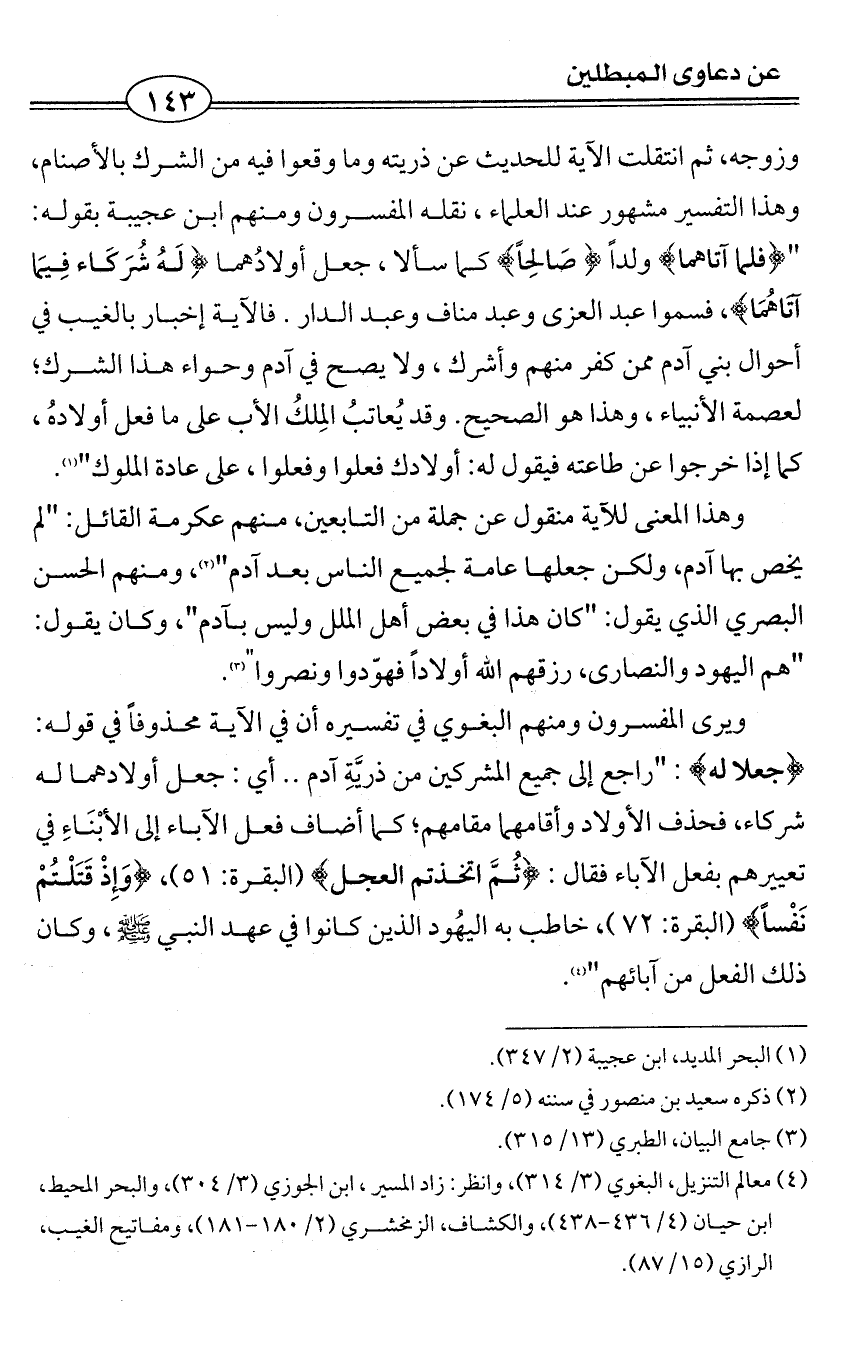 وزوجه، ثم انتقلت الآية للحديث عن ذريته وما وقعوا فيه من الشرك بالأصنام، وهذا التفسير مشهور عند العلماء، نقله المفسرون ومنهم ابن عجيبة بقوله: " {فلما آتاهما} ولداً {صَالِحاً} كما سألا، جعل أولادُهما {لَهُ شُرَكَاء فِيمَا آتَاهُمَا}، فسموا عبد العزى وعبد مناف وعبد الدار. فالآية إخبار بالغيب في أحوال بني آدم ممن كفر منهم وأشرك، ولا يصح في آدم وحواء هذا الشرك؛ لعصمة الأنبياء، وهذا هو الصحيح. وقد يُعاتبُ المِلكُ الأب على ما فعل أولادهُ، كما إذا خرجوا عن طاعته فيقول له: أولادك فعلوا وفعلوا، على عادة الملوك" (¬1).