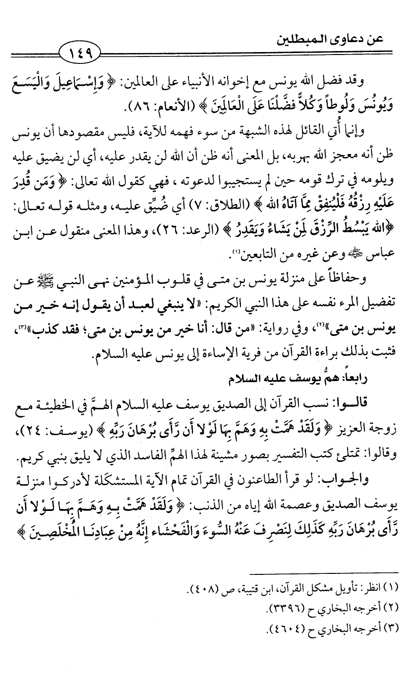 وحفاظاً على منزلة يونس بن متى في قلوب المؤمنين نهى النبي - صلى الله عليه وسلم - عن تفضيل المرء نفسه على هذا النبي الكريم: «لا ينبغي لعبد أن يقول إنه خير من يونس بن متى» (¬2)، وفي رواية: «من قال: أنا خير من يونس بن متى؛ فقد كذب» (¬3)، فثبت بذلك براءة القرآن من فرية الإساءة إلى يونس عليه السلام.