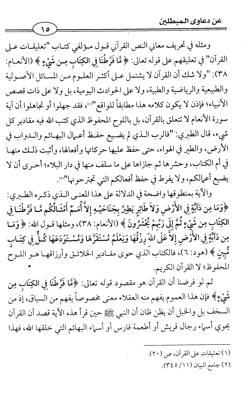ومثله في تحريف معاني النص القرآني قول مؤلفي كتاب "تعليقات على القرآن" في تعليقهم على قوله تعالى: {مَّا فَرَّطْنَا فِي الكِتَابِ مِن شَيْءٍ} (الأنعام: 38): "ولا شك أن القرآن لا يشتمل على أكثر العلوم من المسائل الأصولية والطبيعية والرياضية والطبية، ولا على الحوادث اليومية، بل ولا على ذات قصص الأنبياء؛ فإذن لا يكون كلامه هذا مطابقاً للواقع" (¬1)، فقد جهلوا أو تجاهلوا أن آية سورة الأنعام لا تتعلق بالقرآن، بل باللوح المحفوظ الذي كتب الله فيه مقادير كل شيء، قال الطبري: "فالرب الذي لم يضيع حفظ أعمال البهائم والدواب في الأرض، والطير في الهواء، حتى حفظ عليها حركاتها وأفعالها، وأثبت ذلك منها في أم الكتاب، وحشرها ثم جازاها على ما سلف منها في دار البلاء؛ أحرى أن لا يضيع أعمالكم، ولا يفرط في حفظ أفعالكم التي تجترحونها" (¬2).