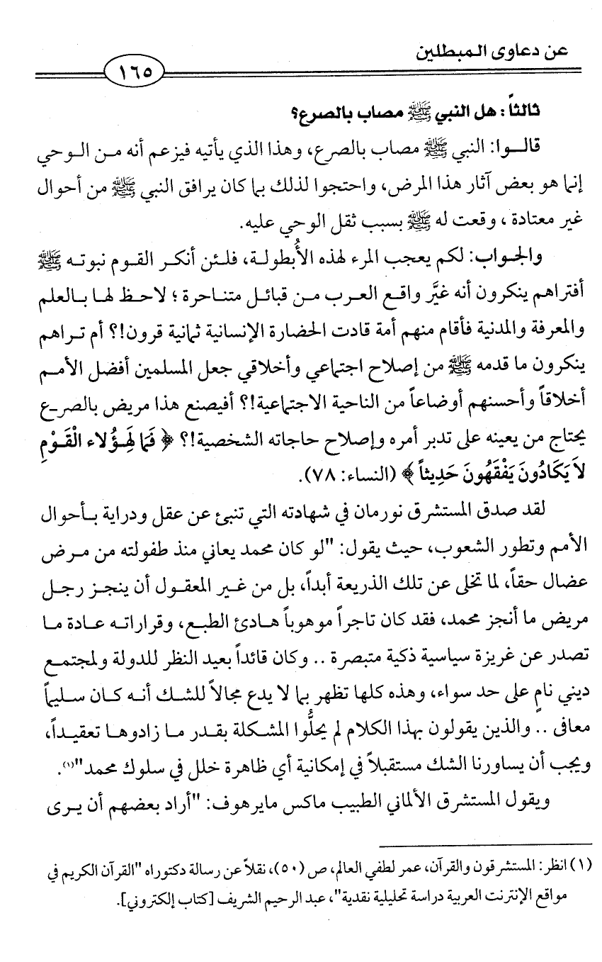 والجواب: لكم يعجب المرء لهذه الأُبطولة، فلئن أنكر القوم نبوته - صلى الله عليه وسلم - أفتراهم ينكرون أنه غيَّر واقع العرب من قبائل متناحرة؛ لاحظ لها بالعلم والمعرفة والمدنية فأقام منهم أمة قادت الحضارة الإنسانية ثمانية قرون!؟ أم تراهم ينكرون ما قدمه - صلى الله عليه وسلم - من إصلاح اجتماعي وأخلاقي جعل المسلمين أفضل الأمم أخلاقاً وأحسنهم أوضاعاً من الناحية الاجتماعية!؟ أفيصنع هذا مريض بالصرع يحتاج من يعينه على تدبر أمره وإصلاح حاجاته الشخصية!؟ {فَمَا لِهَؤُلاء الْقَوْمِ لاَ يَكَادُونَ يَفْقَهُونَ حَدِيثاً} (النساء: 78).