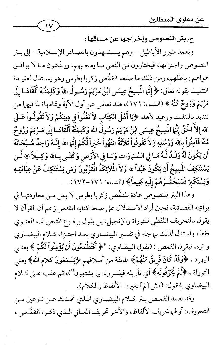 ويعمد مثيرو الأباطيل - وهم يستشهدون بالمصادر الإسلامية - إلى بتر النصوص واجتزائها، فيختارون من النص ما يعجبهم، ويدَعون ما لا يوافق هواهم وباطلهم، ومن ذلك ما صنعه القمُّص زكريا بطرس وهو يستدل لعقيدة التثليث بقوله تعالى: {إِنَّمَا الْمَسِيحُ عِيسَى ابْنُ مَرْيَمَ رَسُولُ اللهِ وَكَلِمَتُهُ أَلْقَاهَا إِلَى مَرْيَمَ وَرُوحٌ مِّنْهُ} (النساء: 171)، فقد تعامى عن أول الآية وتمامها؛ لما فيهما من تنديد بالتثليث ووعيد لأهله {يَا أَهْلَ الْكِتَابِ لاَ تَغْلُوا فِي دِينِكُمْ وَلاَ تَقُولُوا عَلَى الله إِلاَّ الْحَقِّ إِنَّمَا الْمَسِيحُ عِيسَى ابْنُ مَرْيَمَ رَسُولُ الله وَكَلِمَتُهُ أَلْقَاهَا إِلَى مَرْيَمَ وَرُوحٌ مِّنْهُ فَآمِنُوا بِالله وَرُسُلِهِ وَلاَ تَقُولُوا ثَلاَثَةٌ انتَهُوا خَيْراً لَّكُمْ إِنَّمَا الله إِلَهٌ وَاحِدٌ سُبْحَانَهُ أَن يَكُونَ لَهُ وَلَدٌ لَّهُ مَا فِي السَّمَاوَات وَمَا فِي الأَرْضِ وَكَفَى بِالله وَكِيلاً لَّن يَسْتَنكِفَ الْمَسِيحُ أَن يَكُونَ عَبْداً لله وَلاَ الْمَلآئِكَةُ الْمُقَرَّبُونَ وَمَن يَسْتَنكِفْ عَنْ عِبَادَتِهِ وَيَسْتَكْبِرْ فَسَيَحْشُرُهُمْ إِلَيهِ جَمِيعاً} (النساء: 171 - 172).
