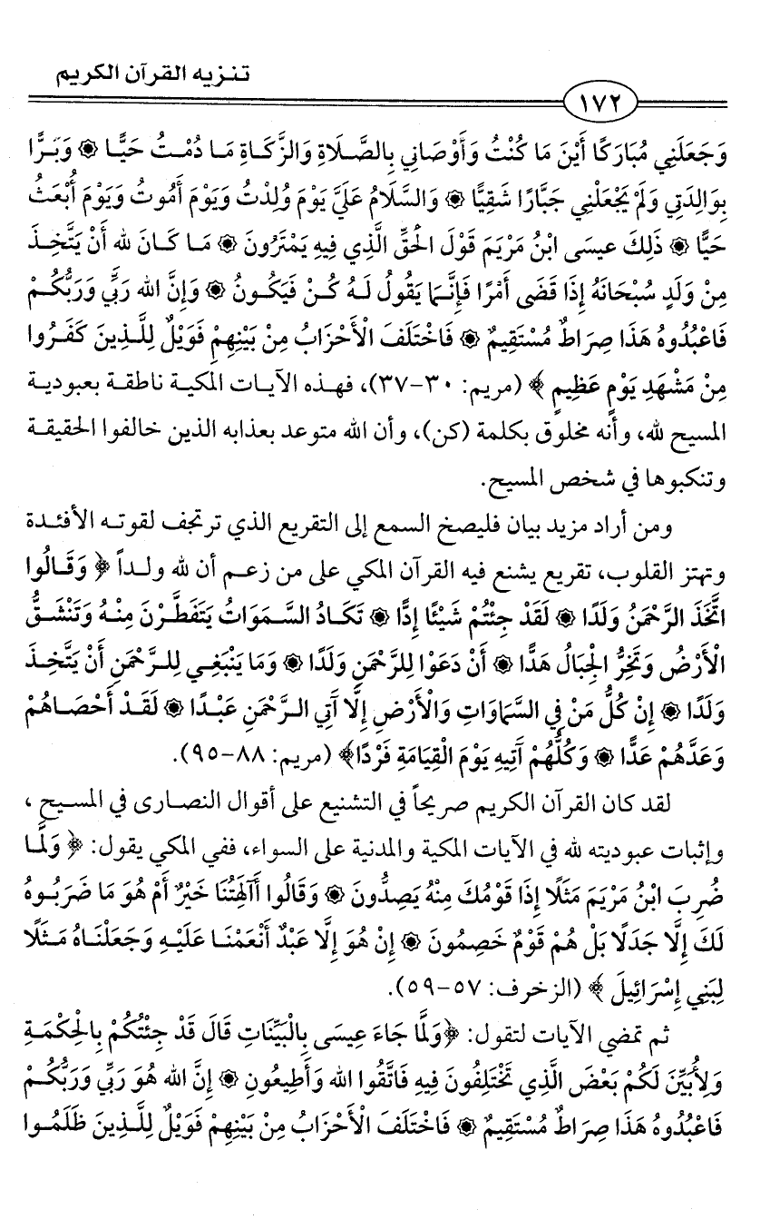 وَجَعَلَنِي مُبَارَكًا أَيْنَ مَا كُنْتُ وَأَوْصَانِي بِالصَّلَاةِ وَالزَّكَاةِ مَا دُمْتُ حَيًّا وَبَرًّا بِوَالِدَتِي وَلَمْ يَجْعَلْنِي جَبَّارًا شَقِيًّا وَالسَّلَامُ عَلَيَّ يَوْمَ وُلِدْتُ وَيَوْمَ أَمُوتُ وَيَوْمَ أُبْعَثُ حَيًّا ذَلِكَ عيسَى ابْنُ مَرْيَمَ قَوْلَ الْحَقِّ الَّذِي فِيهِ يَمْتَرُونَ مَا كَانَ لِله أَنْ يَتَّخِذَ مِنْ وَلَدٍ سُبْحَانَهُ إِذَا قَضَى أَمْرًا فَإِنَّمَا يَقُولُ لَهُ كُنْ فَيَكُونُ وَإِنَّ الله رَبِّي وَرَبُّكُمْ فَاعْبُدُوهُ هَذَا صِرَاطٌ مُسْتَقِيمٌ فَاخْتَلَفَ الْأَحْزَابُ مِنْ بَيْنِهِمِْ فَوَيْلٌ لِلَّذِينَ كَفَرُوا مِنْ مَشْهَدِ يَوْمٍ عَظِيمٍ} (مريم: 30 - 37)، فهذه الآيات المكية ناطقة بعبودية المسيح لله، وأنه مخلوق بكلمة (كن)، وأن الله متوعد بعذابه الذين خالفوا الحقيقة وتنكبوها في شخص المسيح.