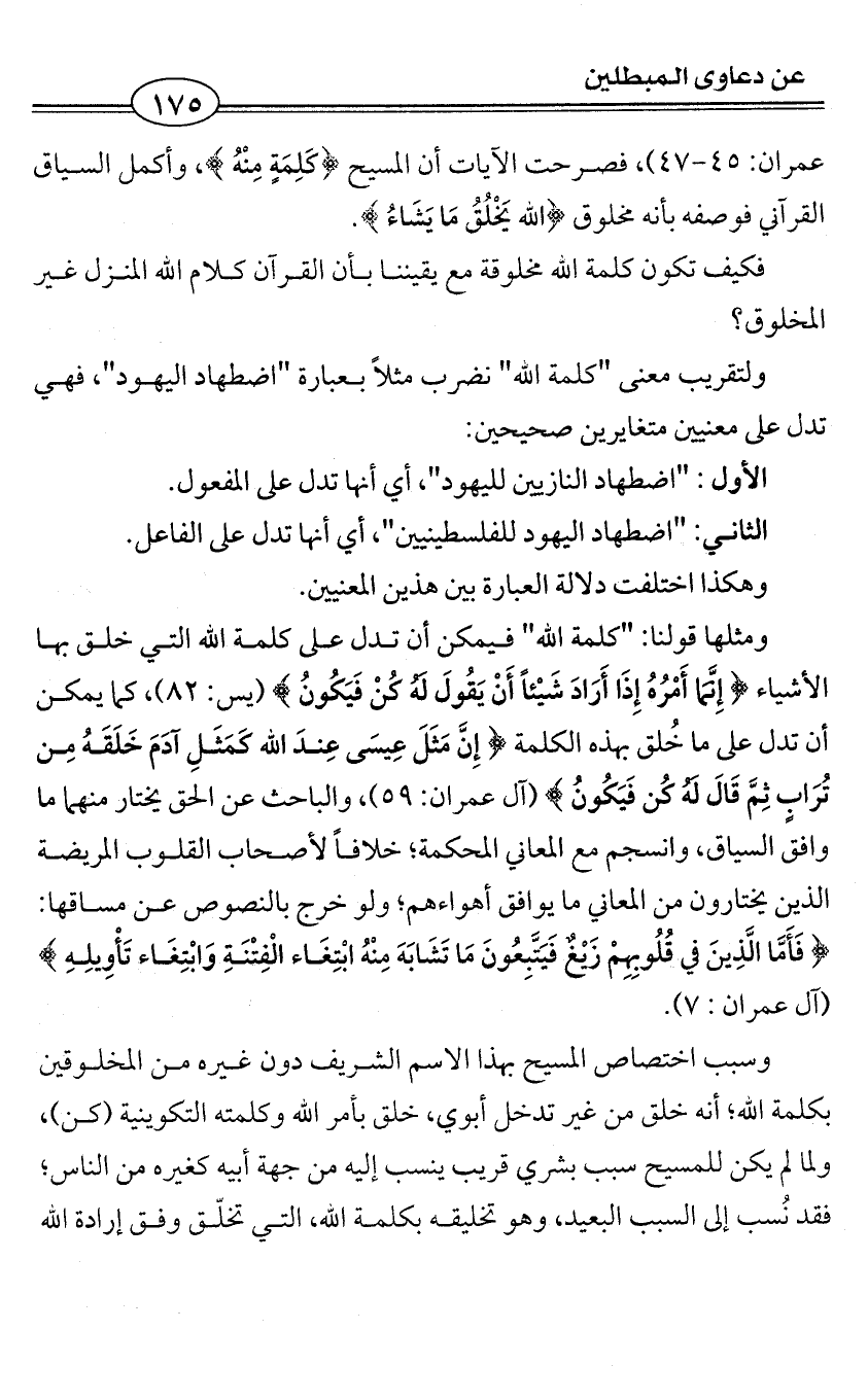 ومثلها قولنا: "كلمة الله" فيمكن أن تدل على كلمة الله التي خلق بها الأشياء {إِنَّمَا أَمْرُهُ إِذَا أَرَادَ شَيْئاً أَنْ يَقُولَ لَهُ كُنْ فَيَكُونُ} (يس: 82)، كما يمكن أن تدل على ما خُلق بهذه الكلمة {إِنَّ مَثَلَ عِيسَى عِندَ الله كَمَثَلِ آدَمَ خَلَقَهُ مِن تُرَابٍ ثِمَّ قَالَ لَهُ كُن فَيَكُونُ} (آل عمران: 59)، والباحث عن الحق يختار منهما ما وافق السياق، وانسجم مع المعاني المحكمة؛ خلافاً لأصحاب القلوب المريضة الذين يختارون من المعاني ما يوافق أهواءهم؛ ولو خرج بالنصوص عن مساقها: {فَأَمَّا الَّذِينَ في قُلُوبِهِمْ زَيْغٌ فَيَتَّبِعُونَ مَا تَشَابَهَ مِنْهُ ابْتِغَاء الْفِتْنَةِ وَابْتِغَاء تَأْوِيلِهِ} (آل عمران: 7).