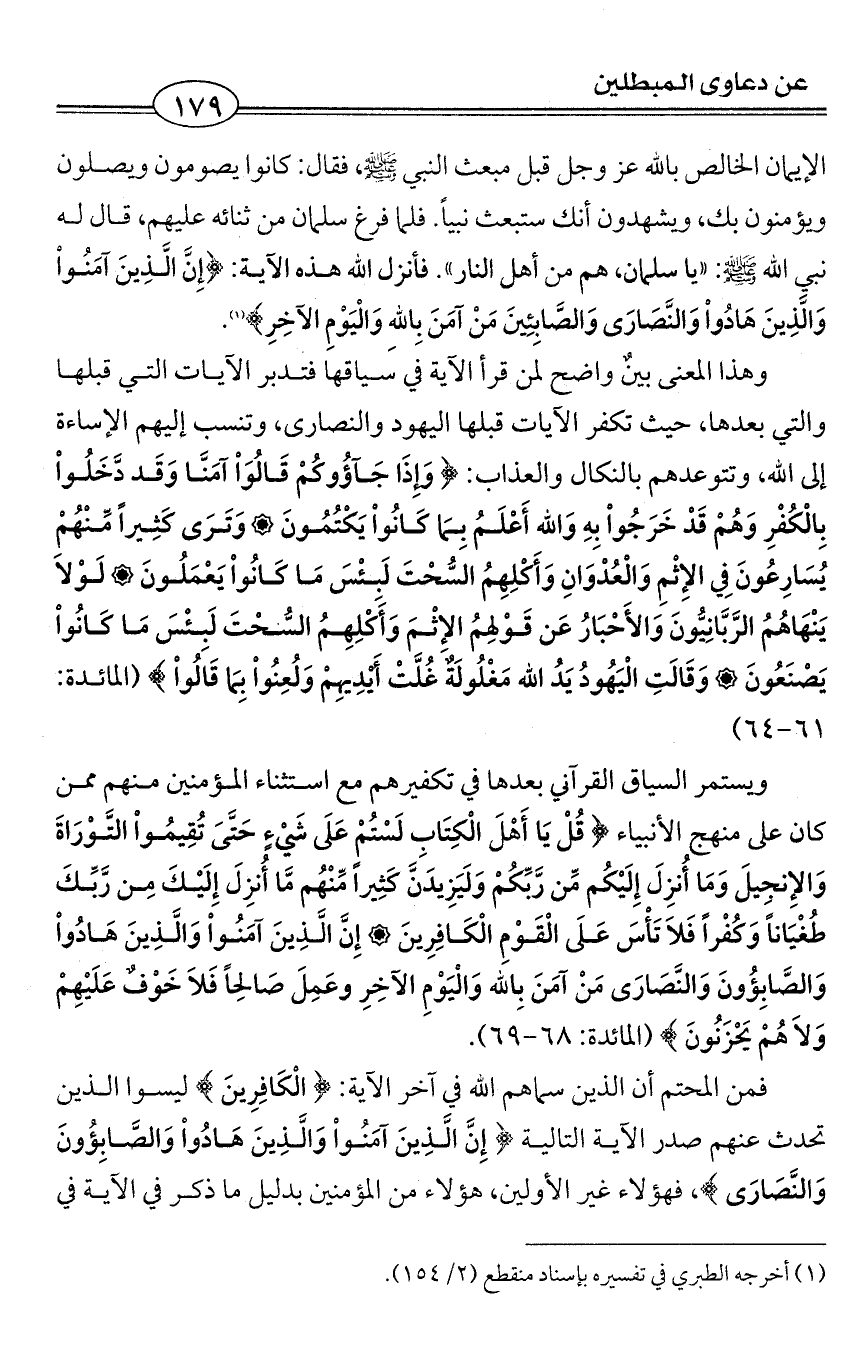 الإيمان الخالص بالله عز وجل قبل مبعث النبي - صلى الله عليه وسلم -، فقال: كانوا يصومون ويصلون ويؤمنون بك، ويشهدون أنك ستبعث نبياً. فلما فرغ سلمان من ثنائه عليهم، قال له نبي الله - صلى الله عليه وسلم -: «يا سلمان، هم من أهل النار». فأنزل الله هذه الآية: {إِنَّ الَّذِينَ آمَنُوا وَالَّذِينَ هَادُوا وَالنَّصَارَى وَالصَّابِئِينَ مَنْ آمَنَ بِاللهِ وَالْيَوْمِ الآخِرِ} (¬1).