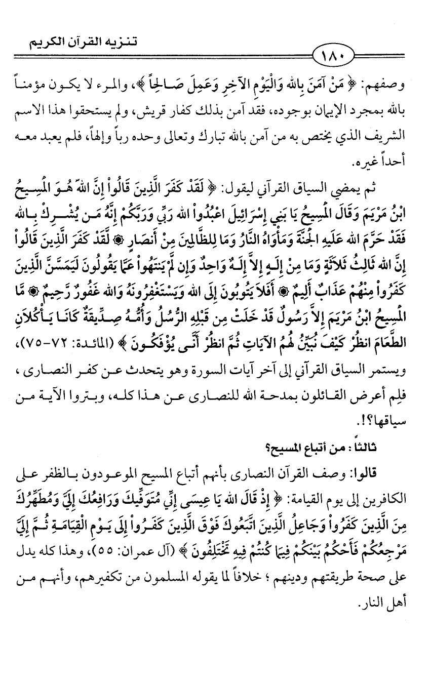 قالوا: وصف القرآن النصارى بأنهم أتباع المسيح الموعودون بالظفر على الكافرين إلى يوم القيامة: {إِذْ قَالَ الله يَا عِيسَى إِنِّي مُتَوَفِّيكَ وَرَافِعُكَ إِلَيَّ وَمُطَهِّرُكَ مِنَ الَّذِينَ كَفَرُوا وَجَاعِلُ الَّذِينَ اتَّبَعُوكَ فَوْقَ الَّذِينَ كَفَرُوا إِلَى يَوْمِ الْقِيَامَةِ ثُمَّ إِلَيَّ مَرْجِعُكُمْ فَأَحْكُمُ بَيْنَكُمْ فِيمَا كُنتُمْ فِيهِ تَخْتَلِفُونَ} (آل عمران: 55)، وهذا كله يدل على صحة طريقتهم ودينهم؛ خلافاً لما يقوله المسلمون من تكفيرهم، وأنهم من أهل النار.