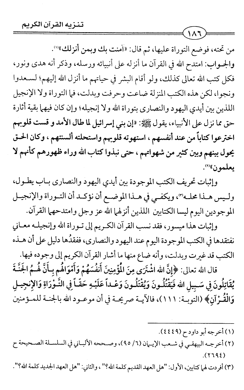وإثبات تحريف الكتب الموجودة بين أيدي اليهود والنصارى باب يطول، وليس هذا محله (¬3)، ويكفي في هذا الموضع أن نؤكد أن التوراة والإنجيل الموجودين اليوم ليسا الكتابين اللذين أنزلهما الله عز وجل وامتدحهما القرآن.