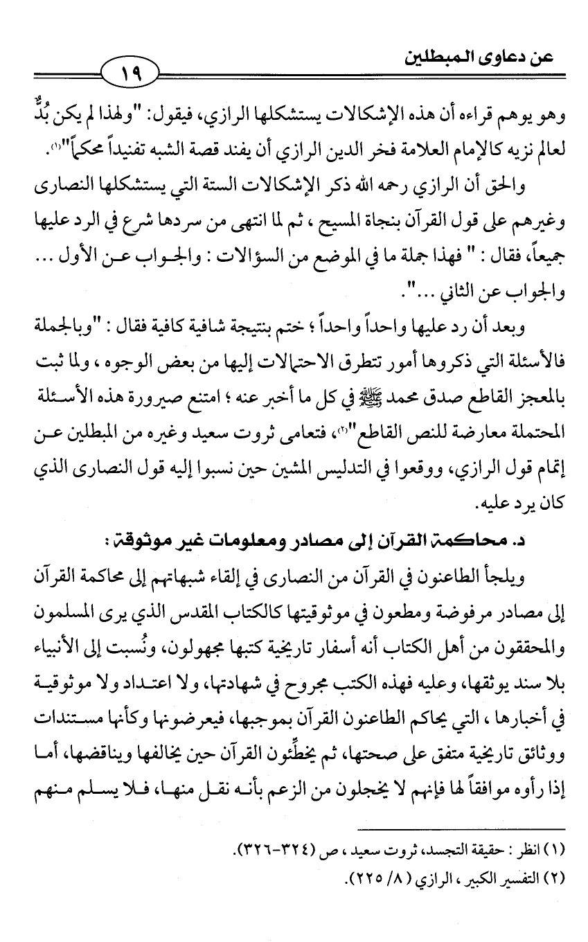 وبعد أن رد عليها واحداً واحداً؛ ختم بنتيجة شافية كافية فقال: "وبالجملة فالأسئلة التي ذكروها أمور تتطرق الاحتمالات إليها من بعض الوجوه، ولما ثبت بالمعجز القاطع صدق محمد - صلى الله عليه وسلم - في كل ما أخبر عنه؛ امتنع صيرورة هذه الأسئلة المحتملة معارضة للنص القاطع" (¬2)، فتعامى ثروت سعيد وغيره من المبطلين عن إتمام قول الرازي، ووقعوا في التدليس المشين حين نسبوا إليه قول النصارى الذي كان يرد عليه.