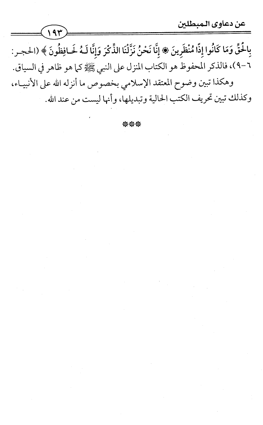 بِالْحَقِّ وَمَا كَانُوا إِذًا مُنْظَرِينَ إِنَّا نَحْنُ نَزَّلْنَا الذِّكْرَ وَإِنَّا لَهُ لَحَافِظُونَ} (الحجر: 6 - 9)، فالذكر المحفوظ هو الكتاب المنزل على النبي - صلى الله عليه وسلم - كما هو ظاهر في السياق.