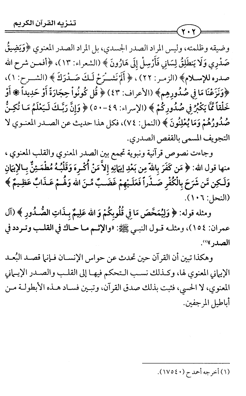 وضيقه وظلمته، وليس المراد الصدر الجسدي، بل المراد الصدر المعنوي {وَيَضِيقُ صَدْرِي وَلَا يَنطَلِقُ لِسَانِي فَأَرْسِلْ إِلَى هَارُونَ} (الشعراء: 13)، {أفمن شرح الله صدره للإسلام} (الزمر: 22)، {أَلَمْ نَشْرَحْ لَكَ صَدْرَكَ} (الشرح: 1)، {وَنَزَعْنَا مَا فِي صُدُورِهِم} (الأعراف: 43) {قُل كُونُوا حِجَارَةً أَوْ حَدِيداً أَوْ خَلْقاً مِّمَّا يَكْبُرُ فِي صُدُورِكُمْ} (الإسراء: 49 - 50) {وَإِنَّ رَبَّكَ لَيَعْلَمُ مَا تُكِنُّ صُدُورُهُمْ وَمَا يُعْلِنُونَ} (النمل: 74)، فكل هذا حديث عن الصدر المعنوي لا التجويف المسمى بالقفص الصدري.