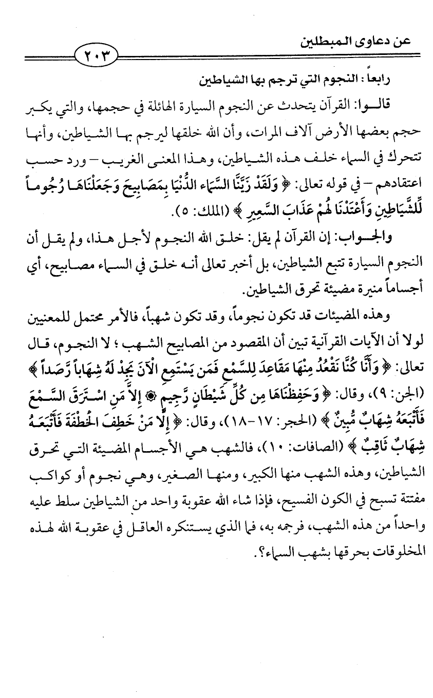 والجواب: إن القرآن لم يقل: خلق الله النجوم لأجل هذا، ولم يقل أن النجوم السيارة تتبع الشياطين، بل أخبر تعالى أنه خلق في السماء مصابيح، أي أجساماً منيرة مضيئة تحرق الشياطين.