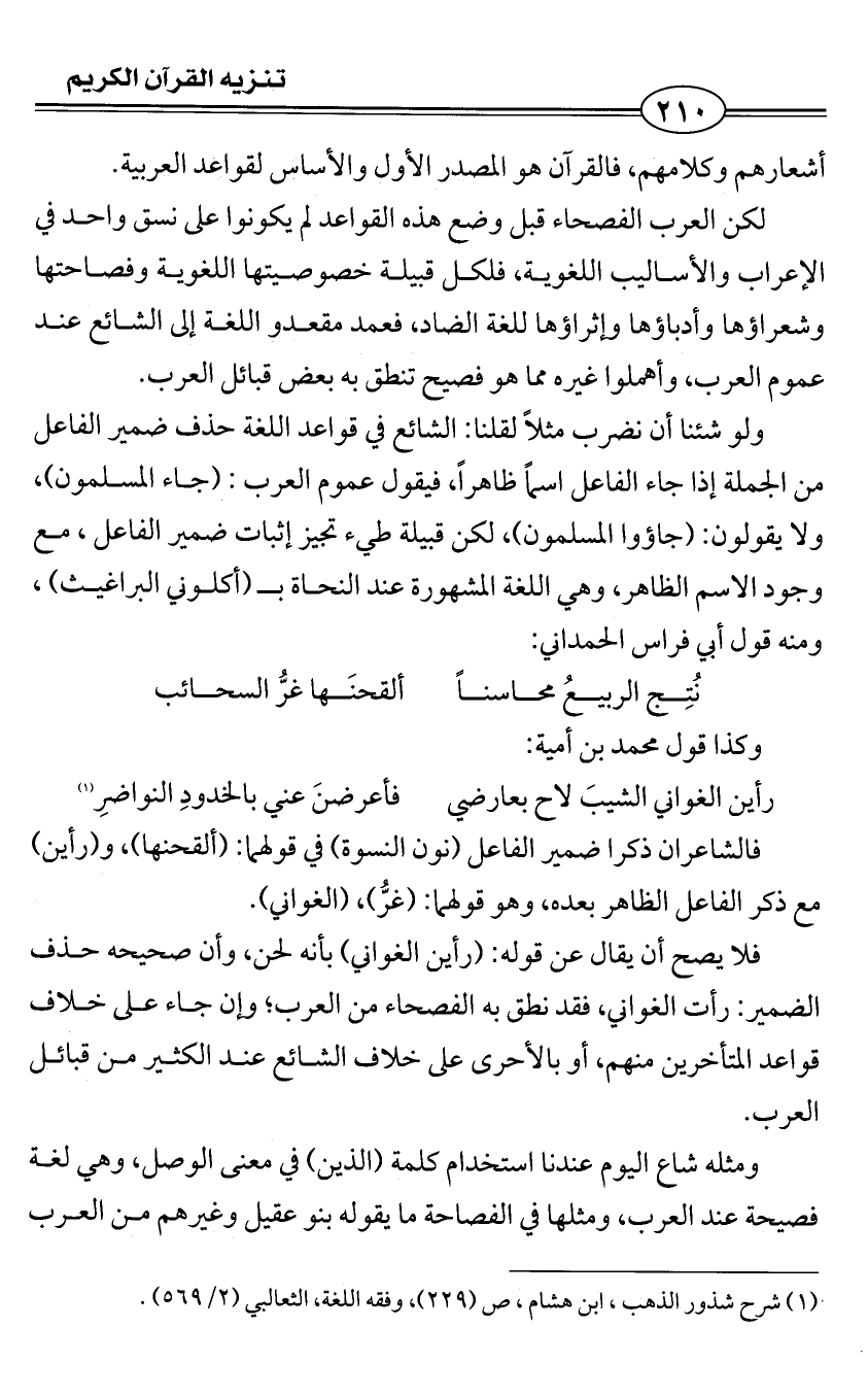 فلا يصح أن يقال عن قوله: (رأين الغواني) بأنه لحن، وأن صحيحه حذف الضمير: رأت الغواني، فقد نطق به الفصحاء من العرب؛ وإن جاء على خلاف قواعد المتأخرين منهم، أو بالأحرى على خلاف الشائع عند الكثير من قبائل العرب.