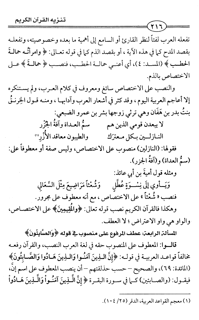 والنصب على الاختصاص سائغ ومعروف في كلام العرب، ولم يستنكره إلا أعاجم العربية اليوم، وقد كثر في أشعار العرب وآدابها، ومنه قول الخِرنقُ بنتُ بدر بن هَفَان وهي ترثي زوجها بشر بن عمرو الضبعي: